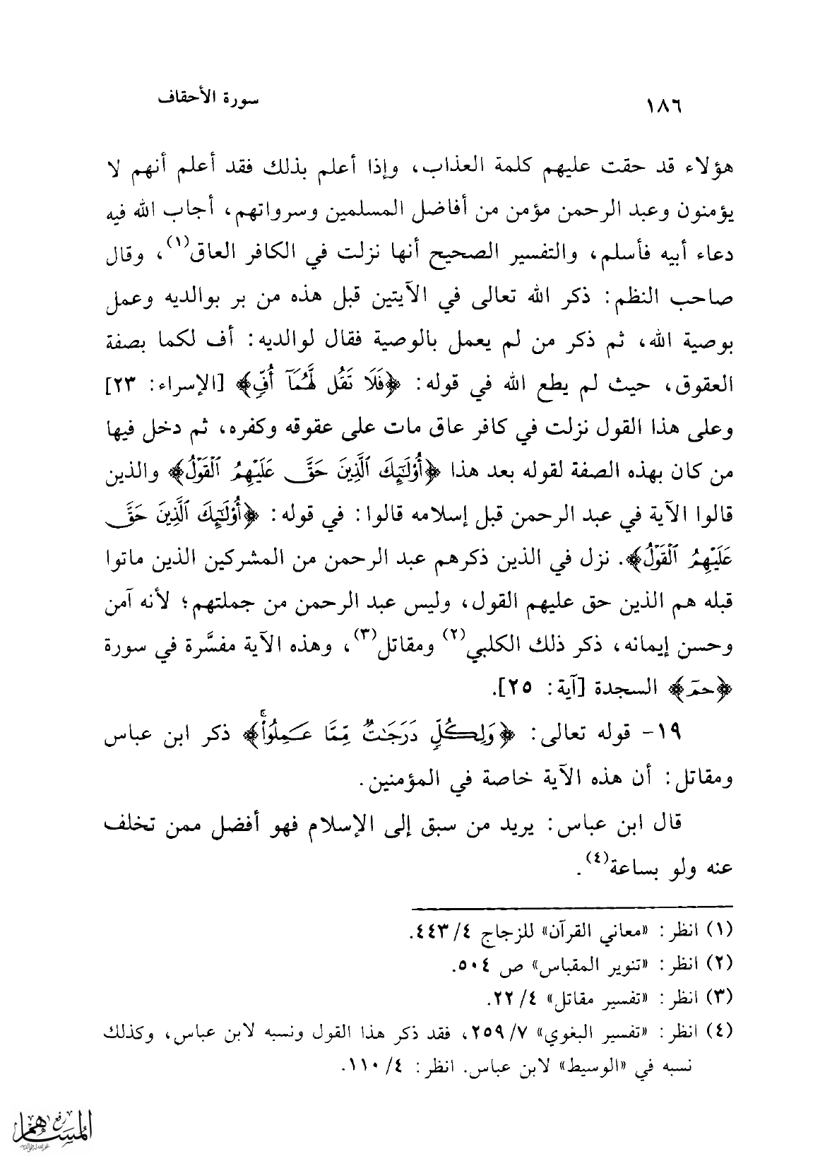 هؤلاء قد حقت عليهم كلمة العذاب، وإذا أعلم بذلك فقد أعلم أنهم لا يؤمنون وعبد الرحمن مؤمن من أفاضل المسلمين وسرواتهم، أجاب الله فيه دعاء أبيه فأسلم، والتفسير الصحيح أنها نزلت في الكافر العاق (¬1)، وقال صاحب النظم: ذكر الله تعالى في الآيتين قبل هذه من بر بوالديه وعمل بوصية الله، ثم ذكر من لم يعمل بالوصية فقال لوالديه: أف لكما بصفة العقوق، حيث لم يطع الله في قوله: {فَلَا تَقُلْ لَهُمَا أُفٍّ} [الإسراء: 23] وعلى هذا القول نزلت في كافر عاق مات على عقوقه وكفره، ثم دخل فيها من كان بهذه الصفة لقوله بعد هذا {أُولَئِكَ الَّذِينَ حَقَّ عَلَيْهِمُ الْقَوْلُ} والذين قالوا الآية في عبد الرحمن قبل إسلامه قالوا: في قوله: {أُولَئِكَ الَّذِينَ حَقَّ عَلَيْهِمُ الْقَوْلُ}. نزل في الذين ذكرهم عبد الرحمن من المشركين الذين ماتوا قبله هم الذين حق عليهم القول، وليس عبد الرحمن من جملتهم؛ لأنه آمن وحسن إيمانه، ذكر ذلك الكلبي (¬2) ومقاتل (¬3)، وهذه الآية مفسَّرة في سورة {حم} السجدة [آية: 25].
