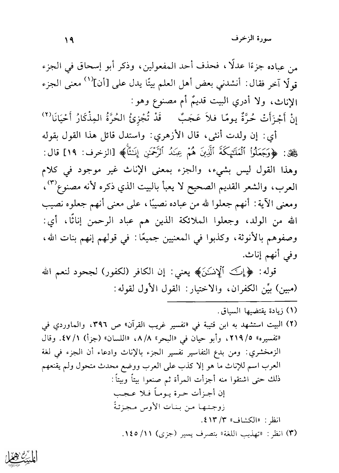 أي: إن ولدت أنثى، قال الأزهري: واستدل قائل هذا القول بقوله -عز وجل-: {وَجَعَلُوا الْمَلَائِكَةَ الَّذِينَ هُمْ عِبَادُ الرَّحْمَنِ إِنَاثًا} [الزخرف: 19] قال: وهذا القول ليس بشيء، والجزء بمعنى الإناث غير موجود في كلام العرب، والشعر القديم الصحيح لا يعبأ بالبيت الذي ذكره لأنه مصنوع (¬3)، ومعنى الآية: أنهم جعلوا لله من عباده نصيبًا، على معنى أنهم جعلوه نصيب الله من الولد، وجعلوا الملائكة الذين هم عباد الرحمن إناثًا، أي: وصفوهم بالأنوثة، وكذبوا في المعنيين جميعًا: في قولهم إنهم بنات الله، وفي أنهم إناث.