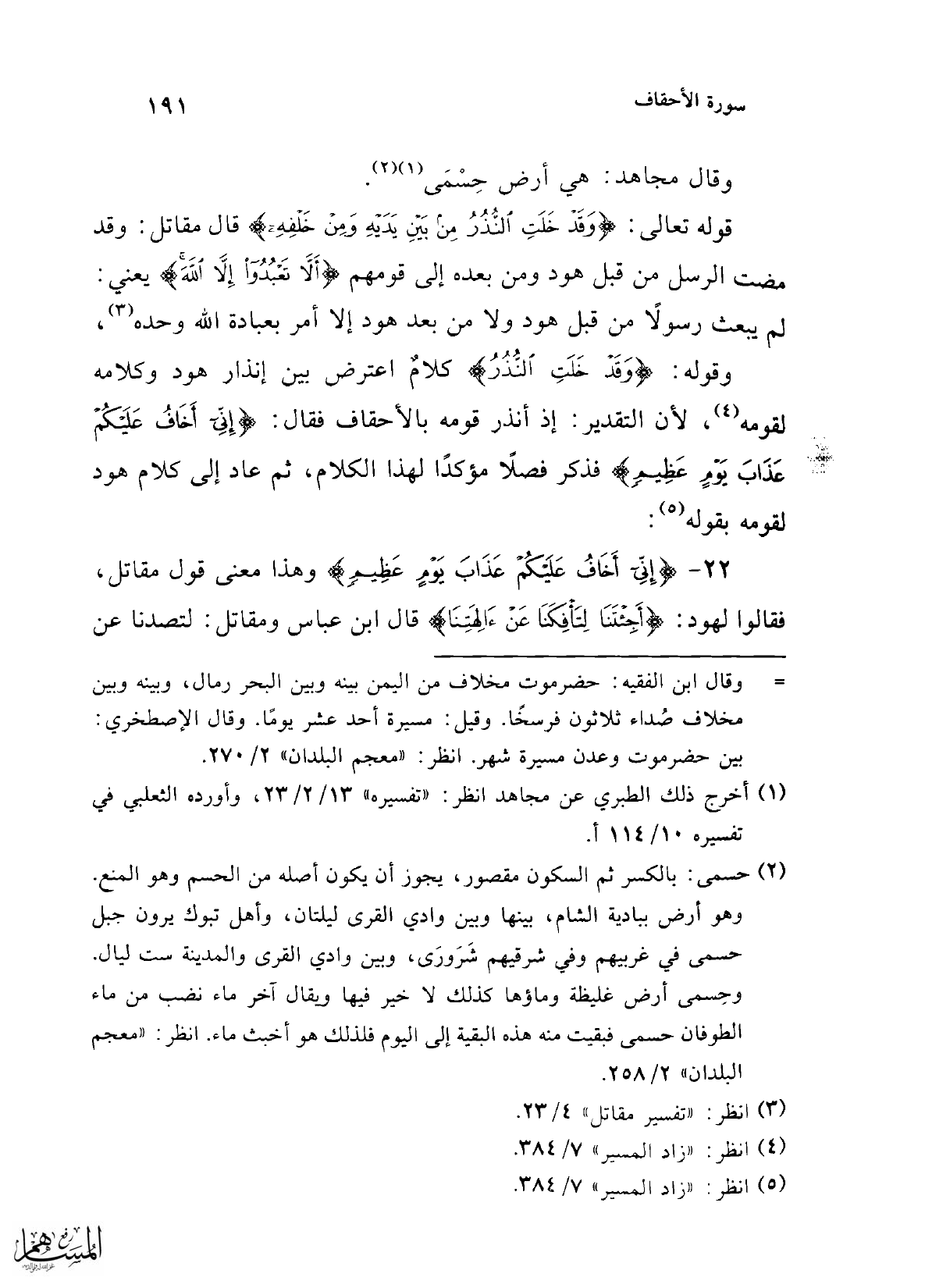 وقوله: {وَقَدْ خَلَتِ النُّذُرُ} كلامٌ اعترض بين إنذار هود وكلامه لقومه (¬4) , لأن التقدير: إذ أنذر قومه بالأحقاف فقال: {إِنِّي أَخَافُ عَلَيْكُمْ عَذَابَ يَوْمٍ عَظِيمٍ} فذكر فصلاً مؤكدًا لهذا الكلام، ثم عاد إلى كلام هود لقومه بقوله (¬5):