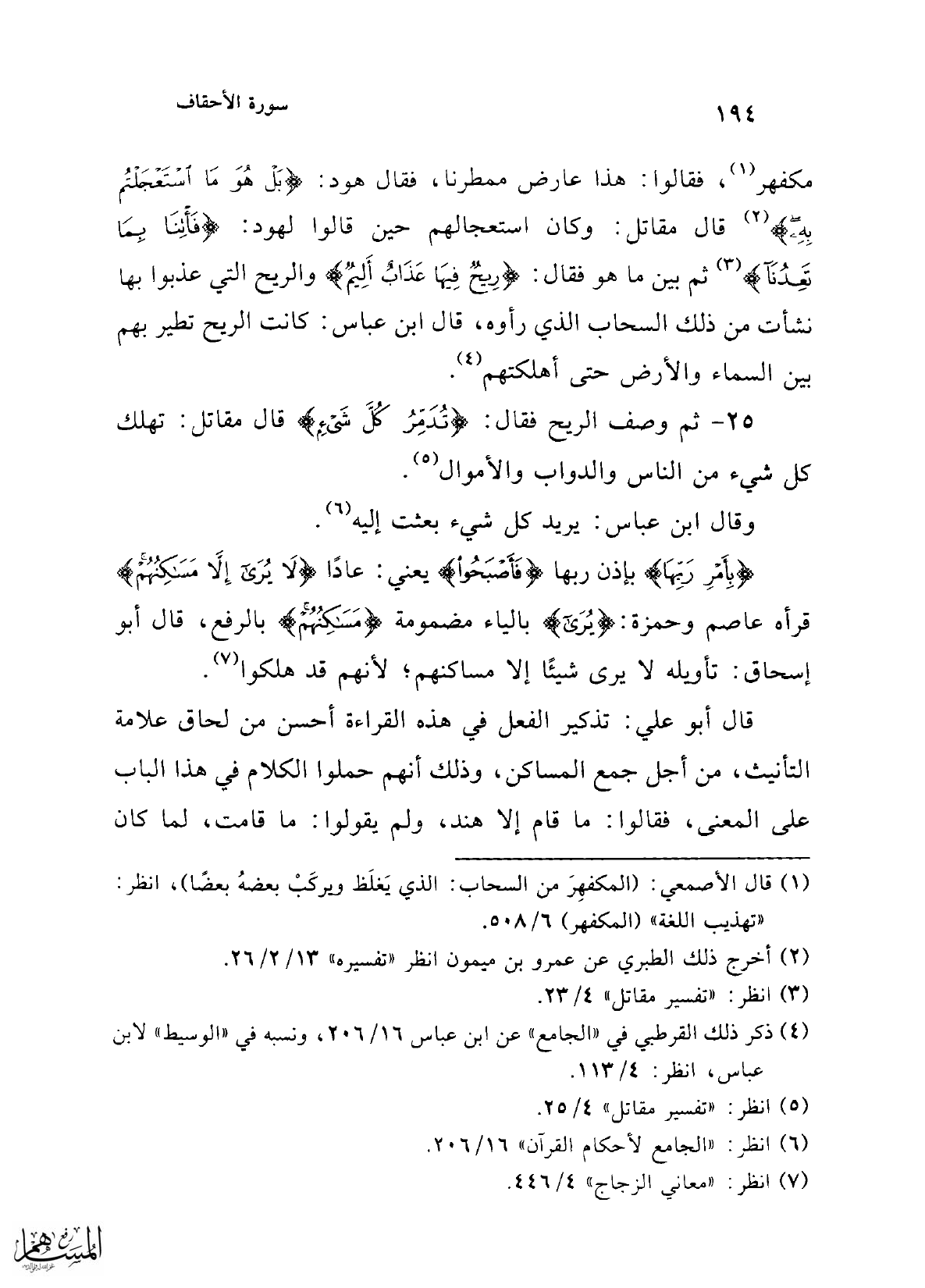 25 - ثم وصف الريح فقال: {تُدَمِّرُ كُلَّ شَيْءٍ} قال مقاتل: تهلك كل شيء من الناس والدواب والأموال (¬5).