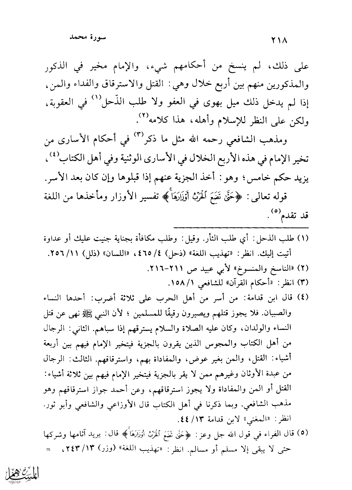 على ذلك، لم ينسخ من أحكامهم شيء، والإمام مخير في الذكور والمذكورين منهم بين أربع خلال وهي: القتل والاسترقاق والفداء والمن، إذا لم يدخل ذلك ميل بهوى في العفو ولا طلب الذّحل (¬1) في العقوبة، ولكن على النظر للإسلام وأهله، هذا كلامه (¬2).