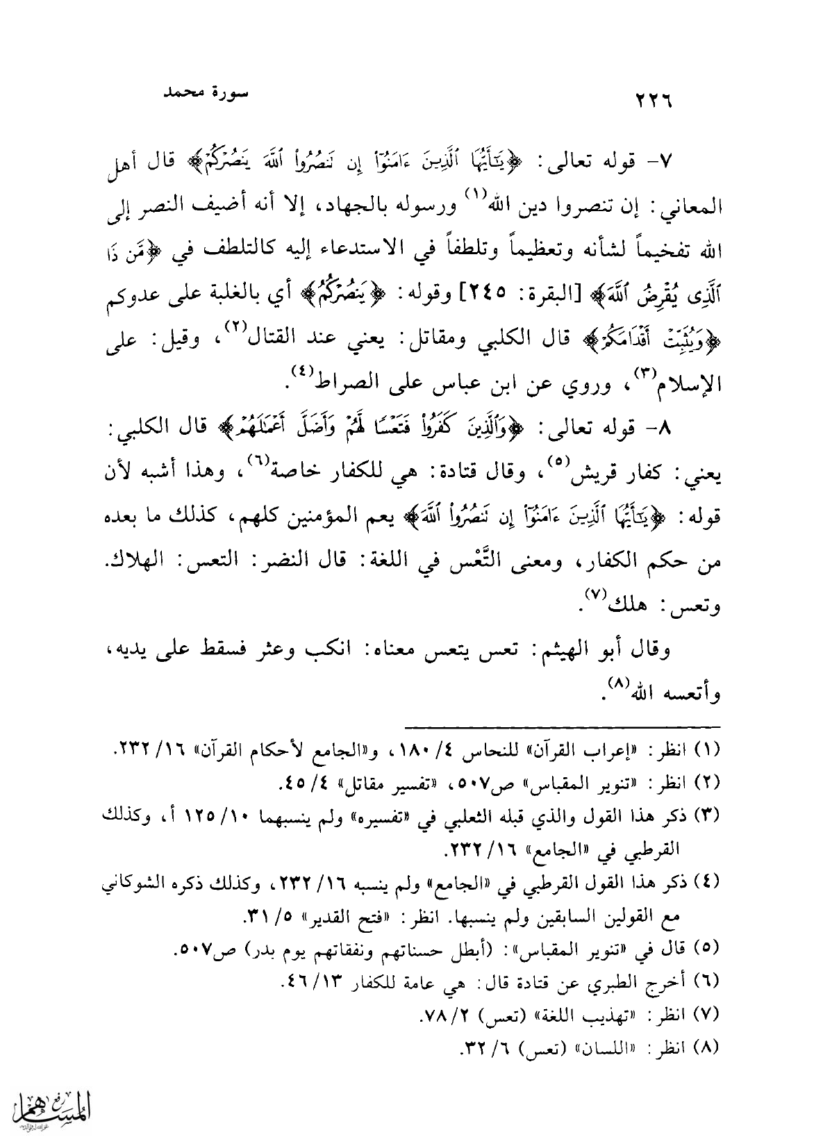 7 - قوله تعالى: {يَا أَيُّهَا الَّذِينَ آمَنُوا إِنْ تَنْصُرُوا اللَّهَ يَنْصُرْكُمْ} قال أهل المعاني: إن تنصروا دين الله (¬1) ورسوله بالجهاد، إلا أنه أضيف النصر إلى الله تفخيماً لشأنه وتعظيماً وتلطفاً في الاستدعاء إليه كالتلطف في {مَنْ ذَا الَّذِي يُقْرِضُ اللَّهَ} [البقرة: 245] وقوله: {يَنْصُرْكُمْ} أي بالغلبة على عدوكم {وَيُثَبِّتْ أَقْدَامَكُمْ} قال الكلبي ومقاتل: يعني عند القتال (¬2)، وقيل: علي الإسلام (¬3)، وروي عن ابن عباس على الصراط (¬4).