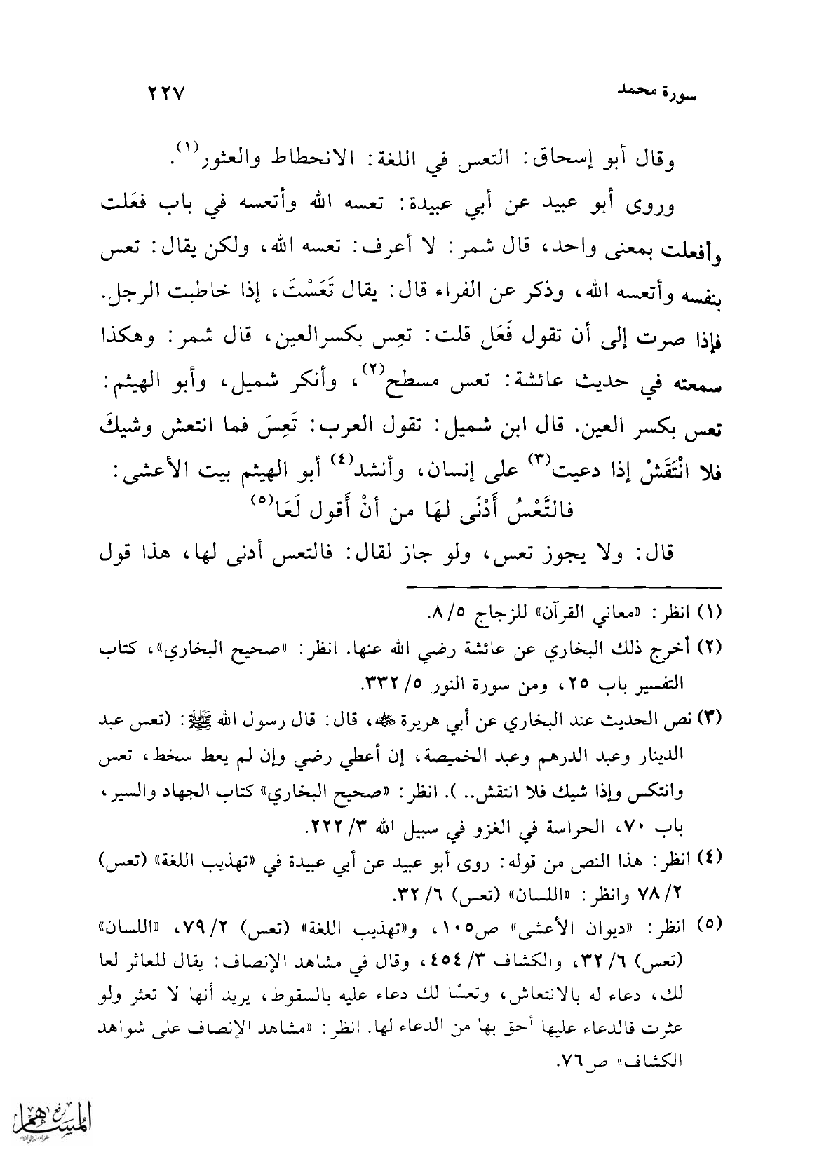 (¬4) انظر: هذا النص من قوله: روى أبو عبيد عن أبي عبيدة في "تهذيب اللغة" (تعس) 2/ 78 وانظر: "اللسان" (تعس) 6/ 32.