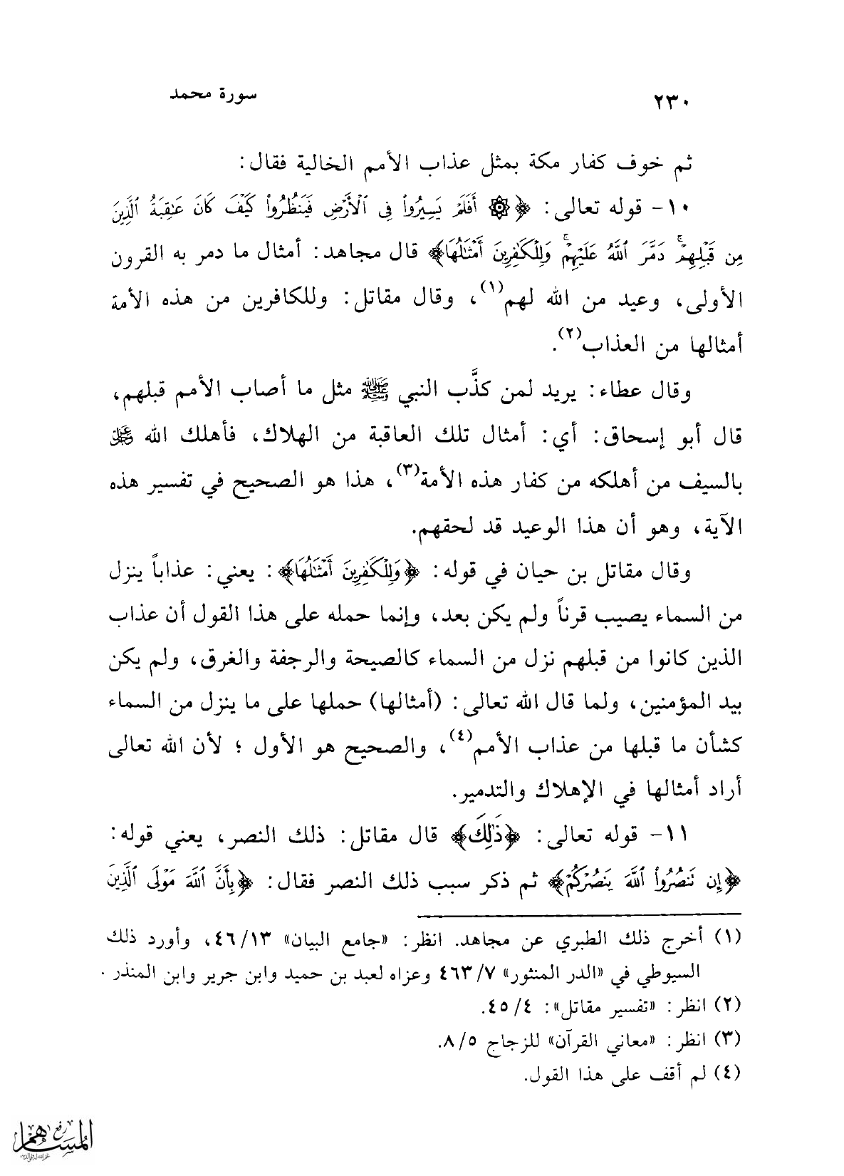 وقال مقاتل بن حيان في قوله: {وَلِلْكَافِرِينَ أَمْثَالُهَا}: يعني: عذاباً ينزل من السماء يصيب قرناً ولم يكن بعد، وإنما حمله على هذا القول أن عذاب الذين كانوا من قبلهم نزل من السماء كالصيحة والرجفة والغرق، ولم يكن بيد المؤمنين، ولما قال الله تعالى: (أمثالها) حملها على ما ينزل من السماء كشأن ما قبلها من عذاب الأمم (¬4)، والصحيح هو الأول؛ لأن الله تعالى أراد أمثالها في الإهلاك والتدمير.