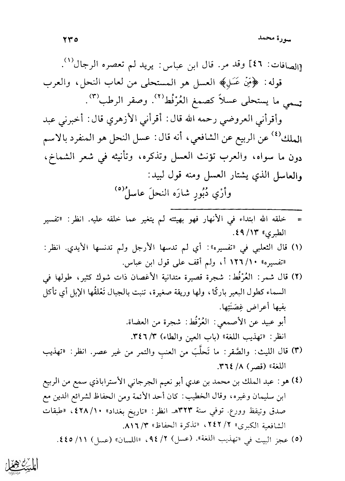 قوله: {مِنْ عَسَلٍ} العسل هو المستحلى من لعاب النحل، والعرب تسمي ما يستحلى عسلاً كصمغ العُرْفُط (¬2). وصقر الرطب (¬3).