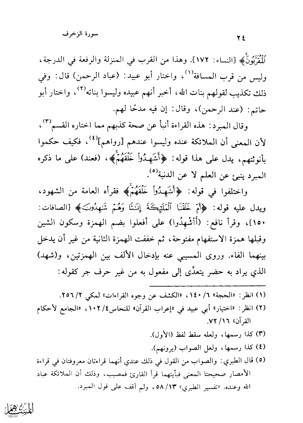 (¬5) قال الطبري: والصواب من القول في ذلك عندي أنهما قراءتان معروفتان في قراءة الأمصار صحيحتا المعنى فبأيتهما قرأ القارىء فمصيب، وذلك أن الملائكة عباد الله وعنده. "تفسير الطبري" 13/ 58، ولم أقف على قول المبرد.