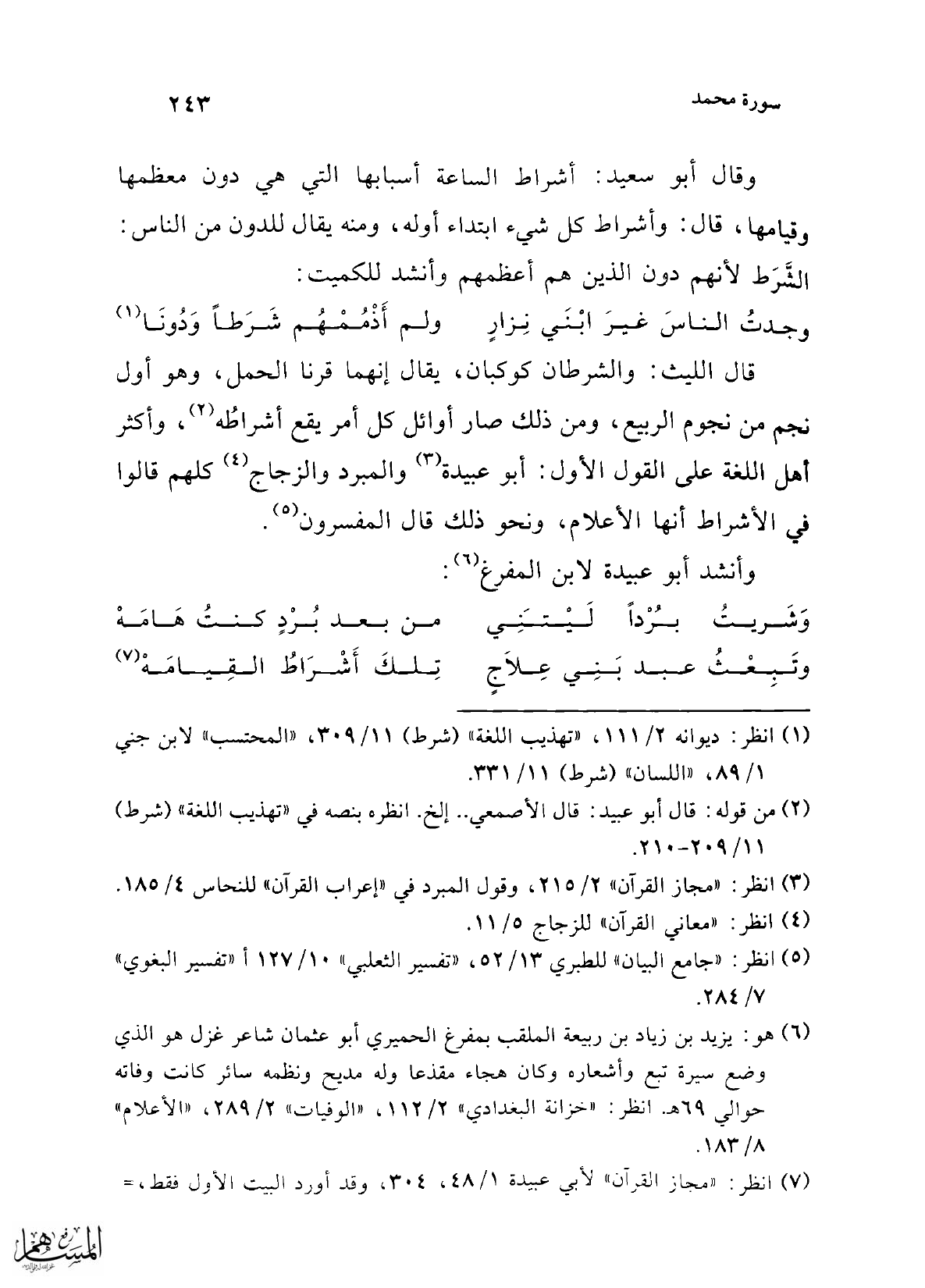 قال الليث: والشرطان كوكبان، يقال إنهما قرنا الحمل، وهو أول نجم من نجوم الربيع، ومن ذلك صار أوائل كل أمر يقع أشراطُه (¬2)، وأكثر أهل اللغة على القول الأول: أبو عبيدة (¬3) والمبرد والزجاج (¬4) كلهم قالوا في الأشراط أنها الأعلام، ونحو ذلك قال المفسرون (¬5).