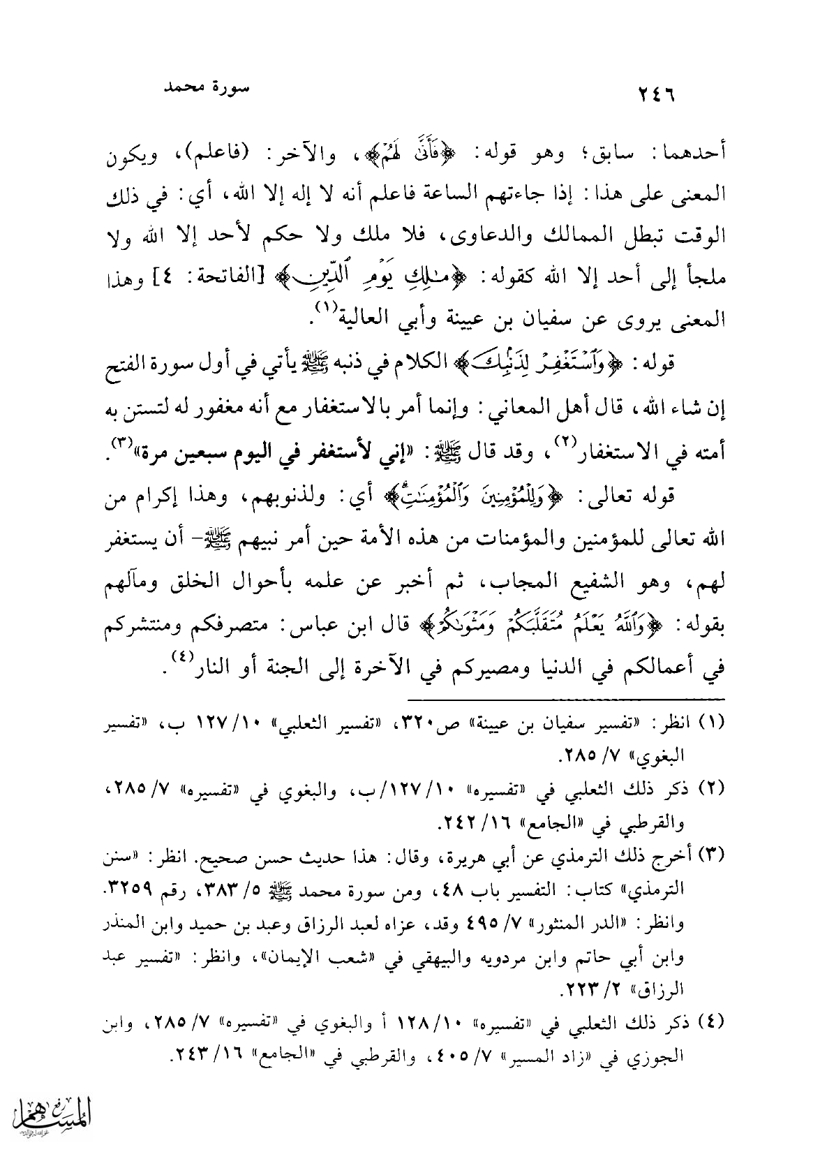 قوله تعالى: {وَلِلْمُؤْمِنِينَ وَالْمُؤْمِنَاتِ} أي: ولذنوبهم، وهذا إكرام من الله تعالى للمؤمنين والمؤمنات من هذه الأمة حين أمر نبيهم -صلى الله عليه وسلم- أن يستغفر لهم، وهو الشفيع المجاب، ثم أخبر عن علمه بأحوال الخلق ومآلهم بقوله: {وَاللَّهُ يَعْلَمُ مُتَقَلَّبَكُمْ وَمَثْوَاكُمْ} قال ابن عباس: متصرفكم ومنتشركم في أعمالكم في الدنيا ومصيركم في الآخرة إلى الجنة أو النار (¬4).