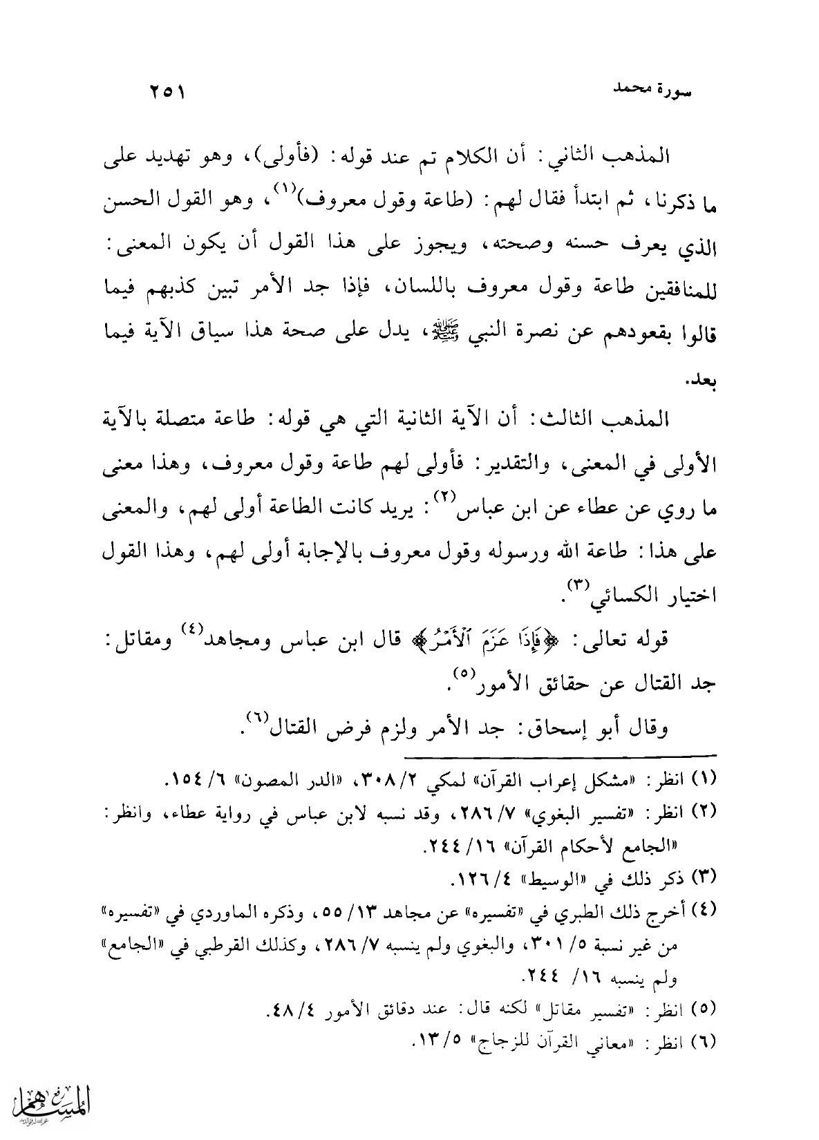 المذهب الثاني: أن الكلام تم سط قوله: (فأولى)، وهو تهديد على ما ذكرنا، ثم ابتدأ فقال لهم: (طاعة وقول معروف) (¬1)، وهو القول الحسن الذي يعرف حسنه وصحته، ويجوز على هذا القول أن يكون المعنى: للمنافقين طاعة وقول معروف باللسان، فإذا جد الأمر تبين كذبهم فيما قالوا بقعودهم عن نصرة النبي -صلى الله عليه وسلم-، يدل على صحة هذا سياق الآية فيما بعد.