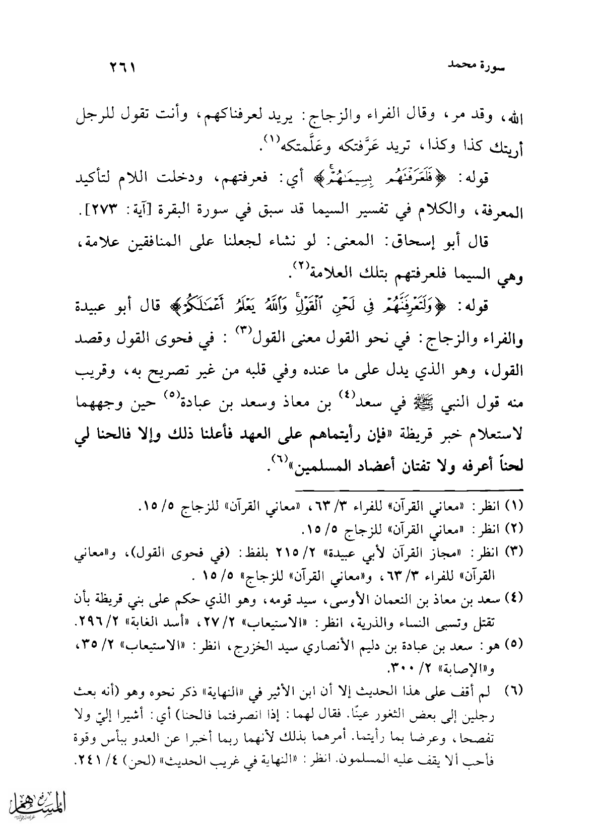 قوله: {وَلَتَعْرِفَنَّهُمْ فِي لَحْنِ الْقَوْلِ وَاللَّهُ يَعْلَمُ أَعْمَالَكُمْ} قال أبو عبيدة والفراء والزجاج: في نحو القول معنى القول (¬3): في فحوى القول وقصد القول، وهو الذي يدل على ما عنده وفي قلبه من غير تصريح به، وقريب منه قول النبي -صلى الله عليه وسلم- في سعد (¬4) بن معاذ وسعد بن عبادة (¬5) حين وجههما لاستعلام خبر قريظة "فإن رأيتماهم على العهد فأعلنا ذلك وإلا فالحنا لي لحناً أعرفه ولا تفتان أعضاد المسلمين" (¬6).