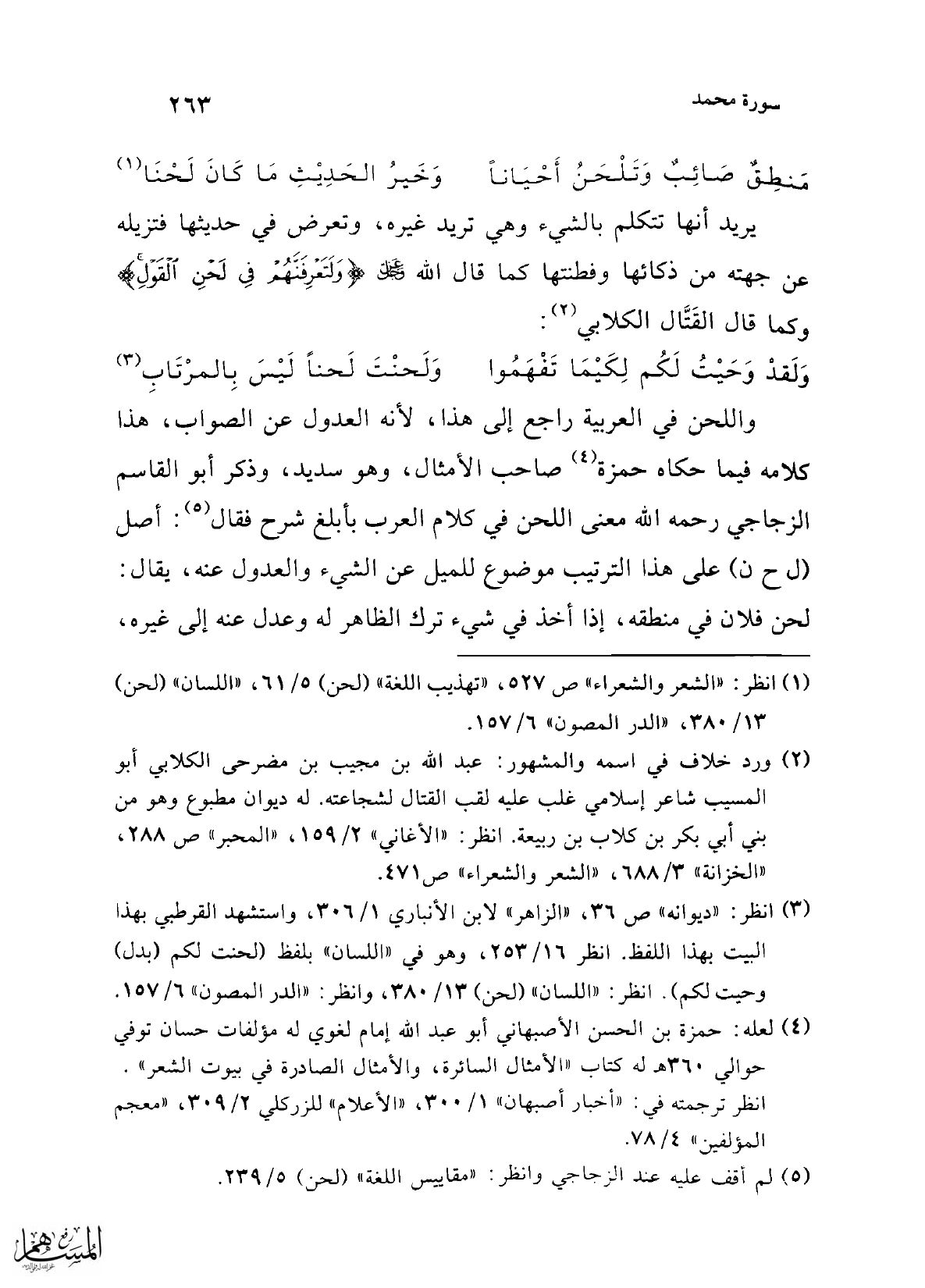 (¬3) انظر: "ديوانه" ص 36، "الزاهر" لابن الأنباري 1/ 306، واستشهد القرطبي بهذا البيت بهذا اللفظ. انظر 16/ 253، وهو في "اللسان" بلفظ (لحنت لكم (بدل) وحيت لكم). انظر: "اللسان" (لحن) 13/ 380، وانظر: "الدر المصون" 6/ 157.