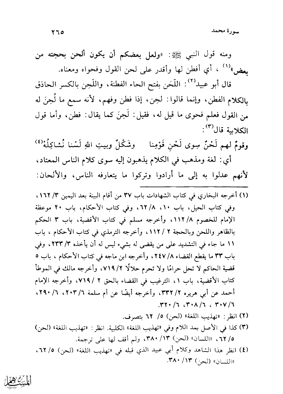 (¬4) انظر هذا الشاهد وكلام أبي عبيد الذي قبله في "تهذيب اللغة" (لحن) 5/ 62، "اللسان" (لحن) 13/ 380.