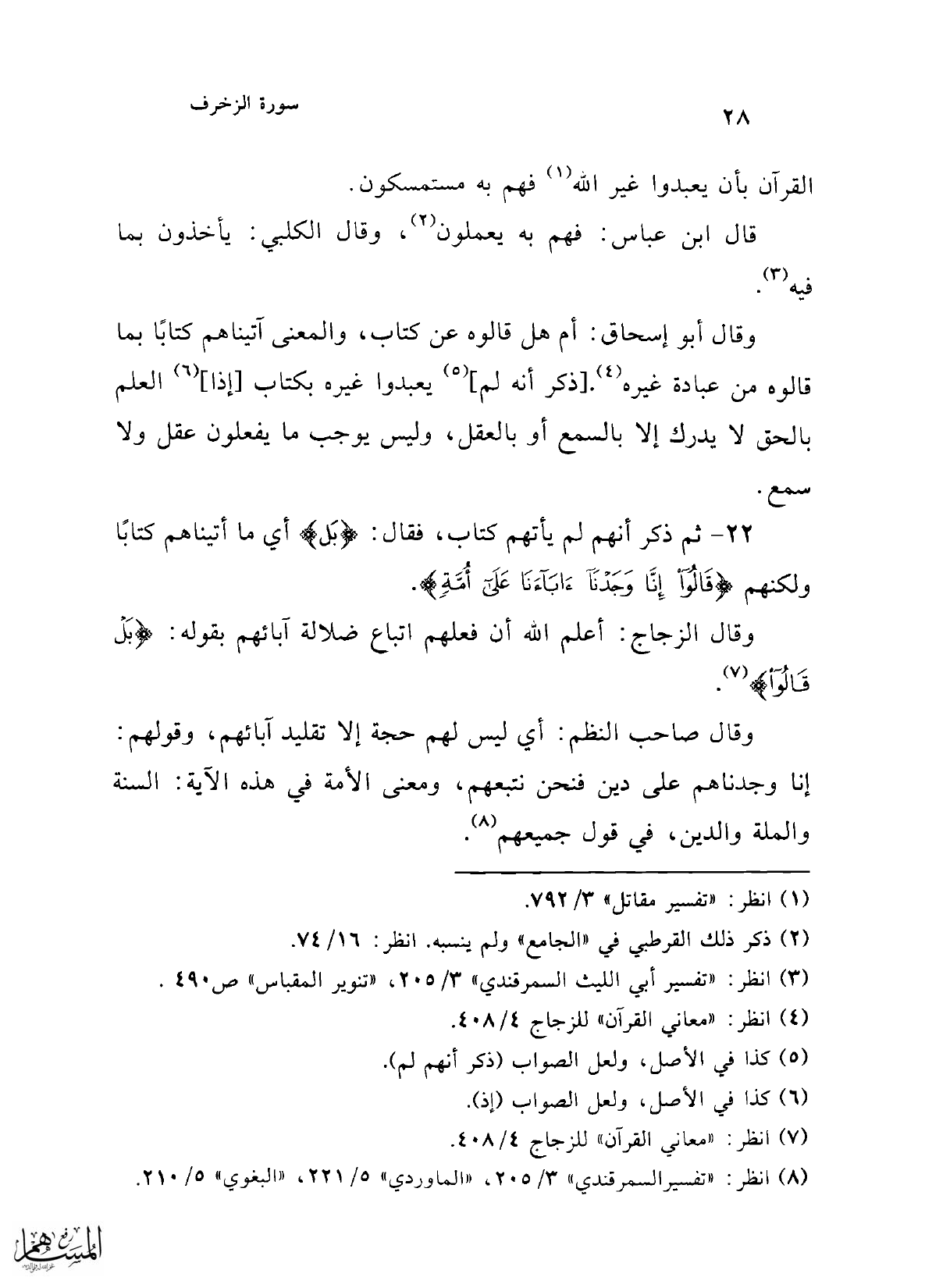 22 - ثم ذكر أنهم لم يأتهم كتاب، فقال: {بَلْ} أي ما أتيناهم كتابًا ولكنهم {قَالُوا إِنَّا وَجَدْنَا آبَاءَنَا عَلَى أُمَّةٍ}.