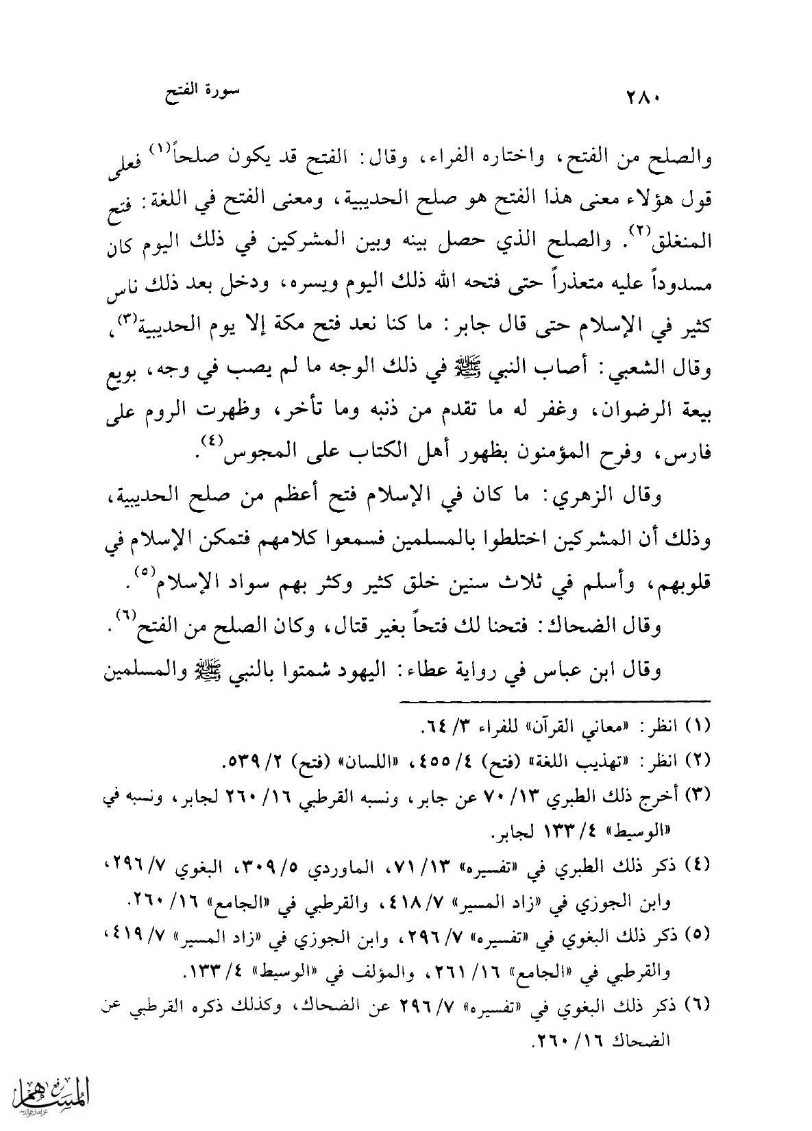 والصلح من الفتح، واختاره الفراء، وقال: الفتح قد يكون صلحاً (¬1) فعلى قول هؤلاء معنى هذا الفتح هو صلح الحديبية، ومعنى الفتح في اللغة: فتح المنغلق (¬2). والصلح الذي حصل بينه وبين المشركين في ذلك اليوم كان مسدوداً عليه متعذراً حتى فتحه الله ذلك اليوم ويسره، ودخل بعد ذلك ناس كثير في الإسلام حتى قال جابر: ما كنا نعد فتح مكة إلا يوم الحديبية (¬3)، وقال الشعبي: أصاب النبي -صلى الله عليه وسلم- في ذلك الوجه ما لم يصب في وجه، بويع بيعة الرضوان، وغفر له ما تقدم من ذنبه وما تأخر، وظهرت الروم على فارس، وفرح المؤمنون بظهور أهل الكتاب على المجوس (¬4).