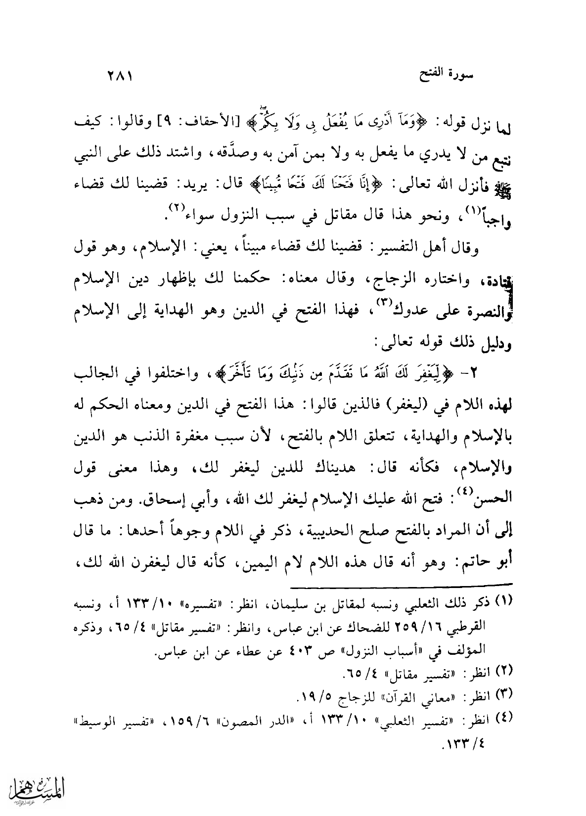 وقال أهل التفسير: قضينا لك قضاء مبيناً، يعني: الإسلام، وهو قول قتادة، واختاره الزجاج، وقال معناه: حكمنا لك بإظهار دين الإسلام والنصرة على عدوك (¬3)، فهذا الفتح في الدين وهو الهداية إلى الإسلام ودليل ذلك قوله تعالى: