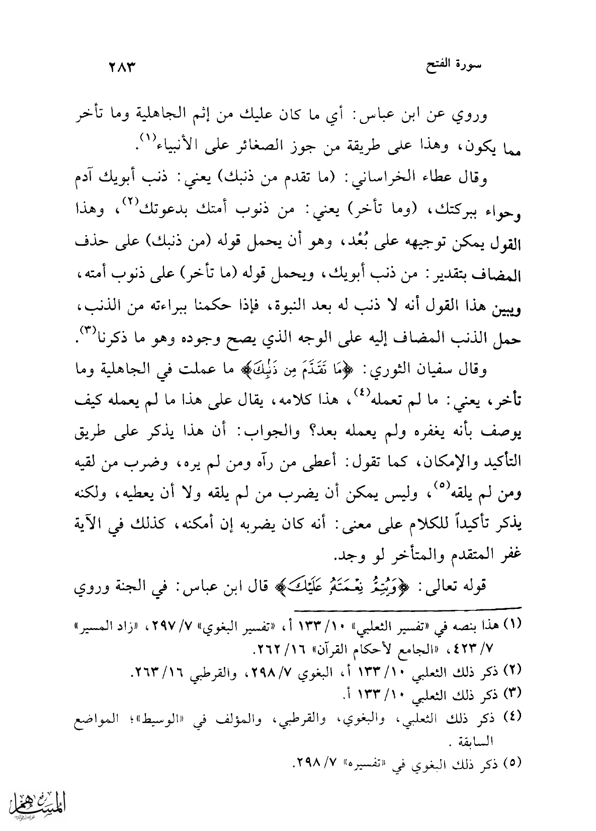 وقال سفيان الثوري: {مَا تَقَدَّمَ مِنْ ذَنْبِكَ} ما عملت في الجاهلية وما تأخر، يعني: ما لم تعمله (¬4)، هذا كلامه، يقال على هذا ما لم يعمله كيف يوصف بأنه يغفره ولم يعمله بعد؟ والجواب: أن هذا يذكر على طريق التأكيد والإمكان، كما تقول: أعطى من رآه ومن لم يره، وضرب من لقيه ومن لم يلقه (¬5)، وليس يمكن أن يضرب من لم يلقه ولا أن يعطيه، ولكنه يذكر تأكيداً للكلام على معنى: أنه كان يضربه إن أمكنه، كذلك في الآية غفر المتقدم والمتأخر لو وجد.