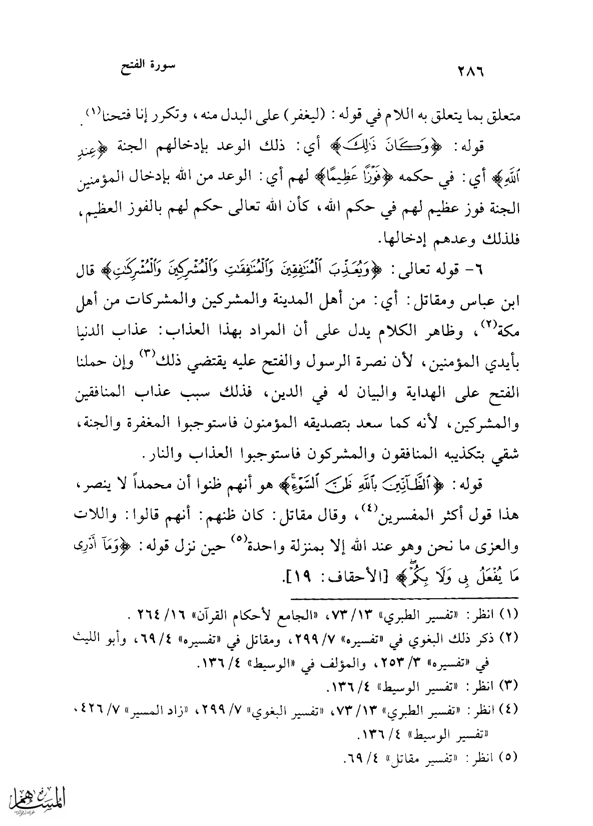 6 - قوله تعالى: {وَيُعَذِّبَ الْمُنَافِقِينَ وَالْمُنَافِقَاتِ وَالْمُشْرِكِينَ وَالْمُشْرِكَاتِ} قال ابن عباس ومقاتل: أي: من أهل المدينة والمشركين والمشركات من أهل مكة (¬2)، وظاهر الكلام يدل على أن المراد بهذا العذاب: عذاب الدنيا بأيدي المؤمنين؛ لأن نصرة الرسول والفتح عليه يقتضي ذلك (¬3) وإن حملنا الفتح على الهداية والبيان له في الدين، فذلك سبب عذاب المنافقين والمشركين, لأنه كما سعد بتصديقه المؤمنون فاستوجبوا المغفرة والجنة، شقي بتكذيبه المنافقون والمشركون فاستوجبوا العذاب والنار.