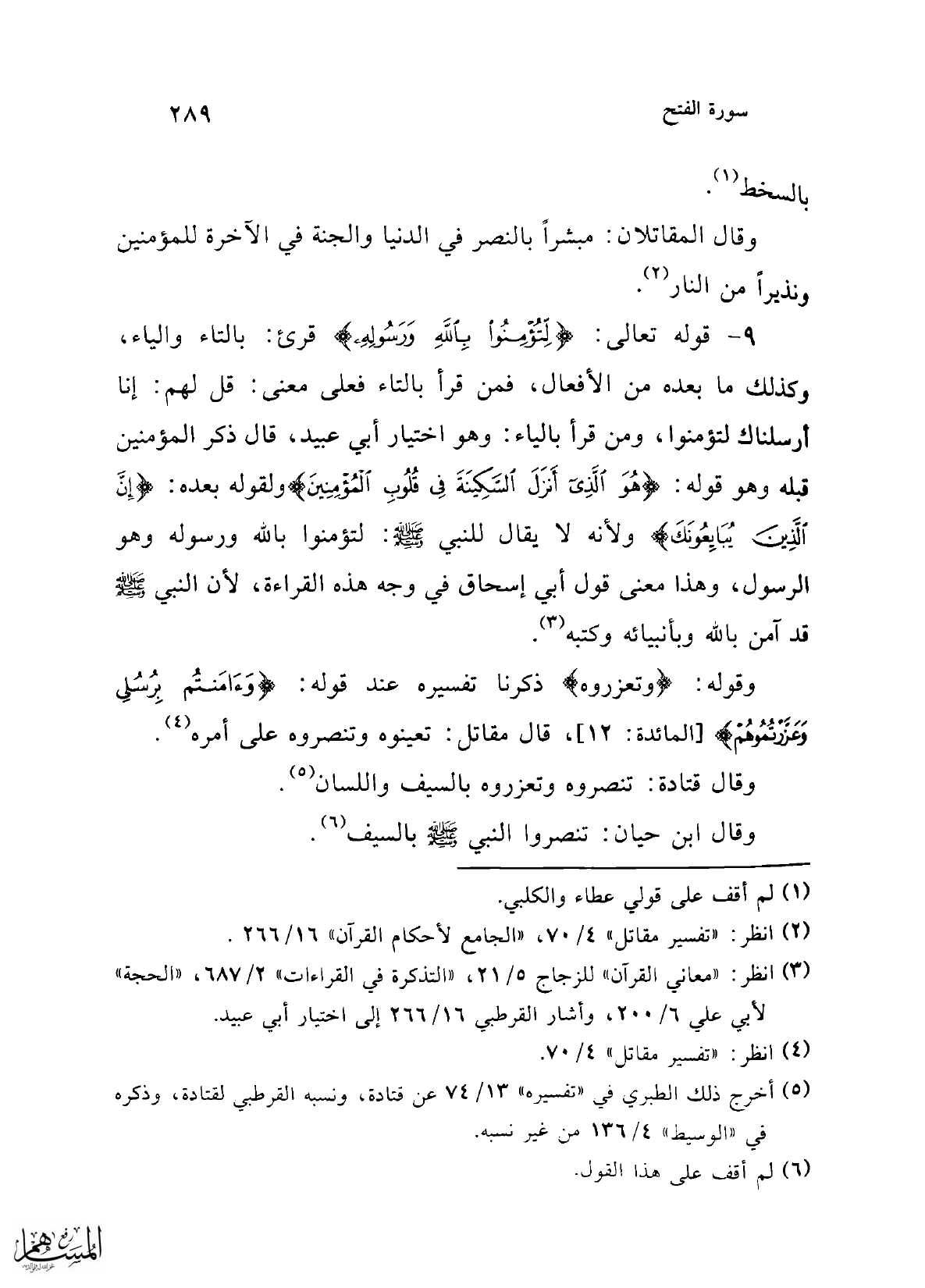 9 - قوله تعالى: {لِتُؤْمِنُوا بِاللَّهِ وَرَسُولِهِ} قرئ: بالتاء والياء، وكذلك ما بعده من الأفعال، فمن قرأ بالتاء فعلى معنى: قل لهم: إنا أرسلناك لتؤمنوا، ومن قرأ بالياء: وهو اختيار أبي عبيد، قال ذكر المؤمنين قبله وهو قوله: {هُوَ الَّذِي أَنْزَلَ السَّكِينَةَ فِي قُلُوبِ الْمُؤْمِنِينَ} ولقوله بعده: {إِنَّ الَّذِينَ يُبَايِعُونَكَ} ولأنه لا يقال للنبي -صلى الله عليه وسلم-: لتؤمنوا بالله ورسوله وهو الرسول، وهذا معنى قول أبي إسحاق في وجه هذه القراءة, لأن النبي -صلى الله عليه وسلم- قد آمن بالله وبأنبيائه وكتبه (¬3).