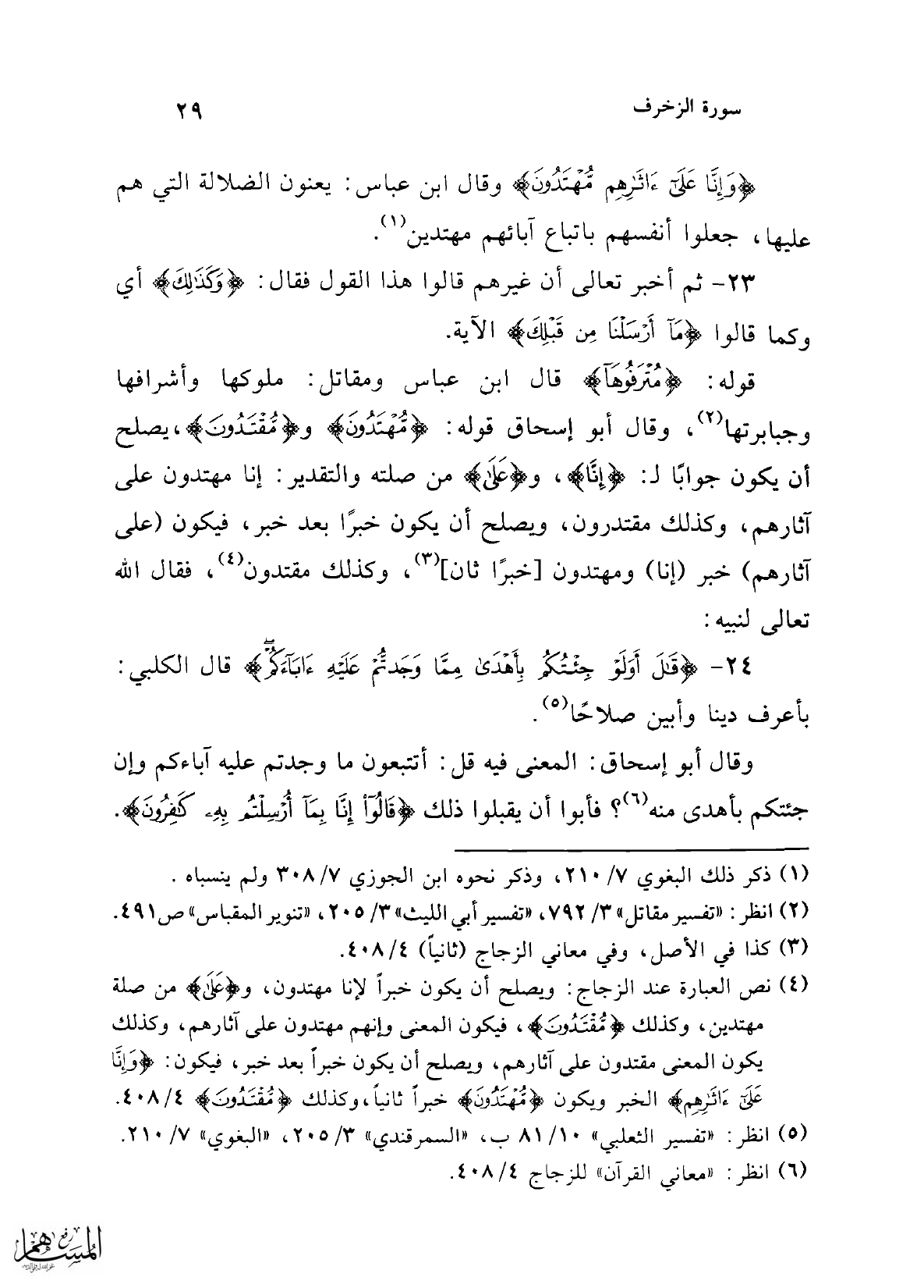 قوله: {مُتْرَفُوهَا} قال ابن عباس ومقاتل: ملوكها وأشرافها وجابرتها (¬2)، وقال أبو إسحاق قوله: {مُهْتَدُونَ} و {مُقْتَدُونَ}، يصلح أن يكون جوابًا لـ: {إِنَّا}، و {عَلَى} من صلته والتقدير: إنا مهتدون على آثارهم، وكذلك مقتدرون، ويصلح أن يكون خبرًا بعد خبر، فيكون (على آثارهم) خبر (إنا) ومهتدون [خبرًا ثان] (¬3)، وكذلك مقتدون (¬4)، فقال الله تعالى لنبيه: