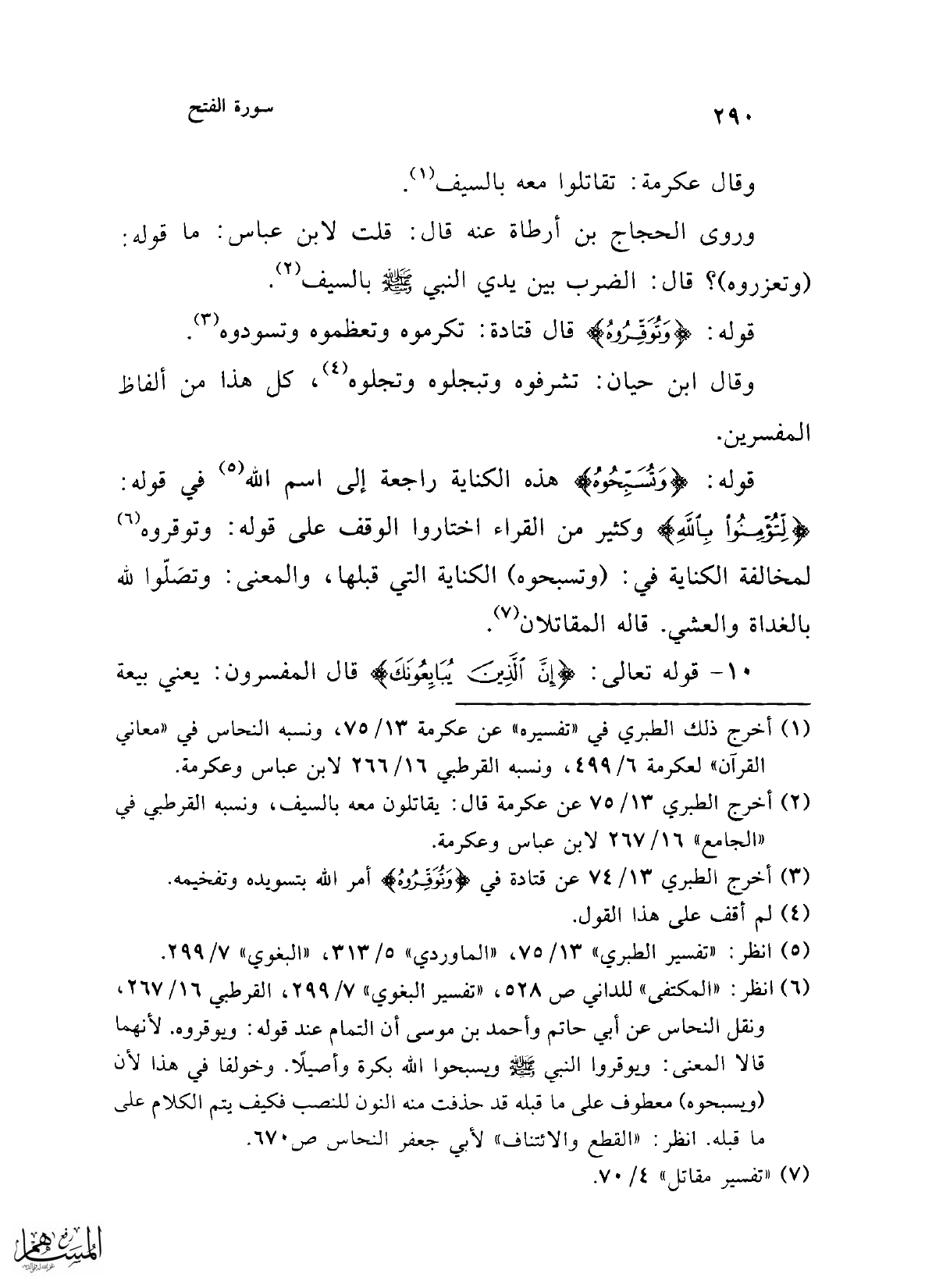 (¬3) أخرج الطبري 13/ 74 عن قتادة في {وَتُوَقِّرُوهُ} أمر الله بتسويده وتفخيمه.