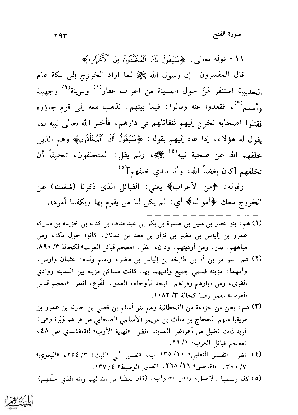 11 - قوله تعالى: {سَيَقُولُ لَكَ الْمُخَلَّفُونَ مِنَ الْأَعْرَابِ}.