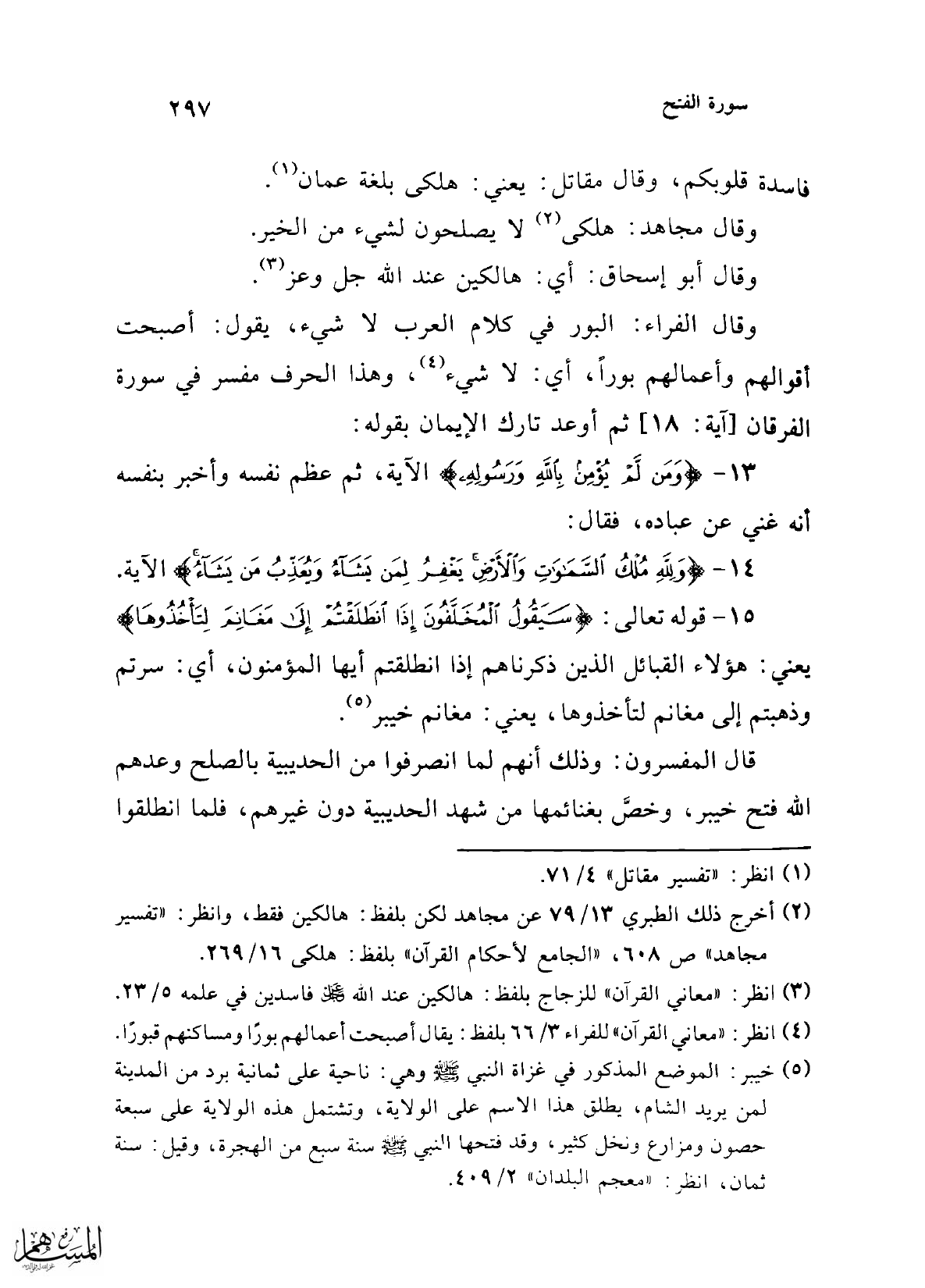 وقال الفراء: البور في كلام العرب لا شيء، يقول: أصبحت أقوالهم وأعمالهم بوراً، أي: لا شيء (¬4)، وهذا الحرف مفسر في سورة الفرقان [آية: 18] ثم أوعد تارك الإيمان بقوله: