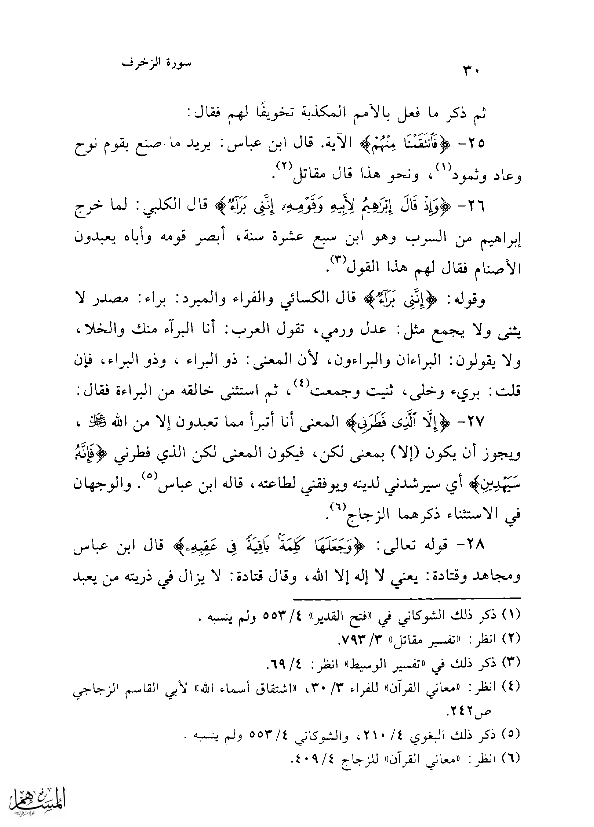 26 - {وَإِذْ قَالَ إِبْرَاهِيمُ لِأَبِيهِ وَقَوْمِهِ إِنَّنِي بَرَاءٌ} قال الكلبي: لما خرج إبراهيم من السرب وهو ابن سبع عشرة سنة، أبصر قومه وأباه يعبدون الأصنام فقال لهم هذا القول (¬3).