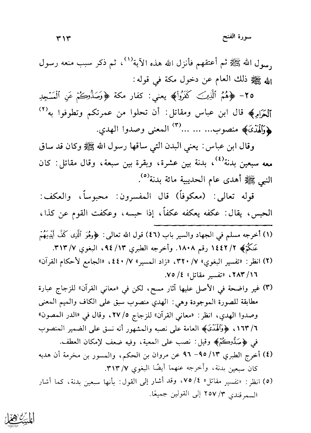 25 - {هُمُ الَّذِينَ كَفَرُوا} يعني: كفار مكة {وَصَدُّوكُمْ عَنِ الْمَسْجِدِ الْحَرَامِ} قال ابن عباس ومقاتل: أن تحلوا من عمرتكم وتطوفوا به (¬2) {وَالْهَدْيَ} منصوب ... ... ... (¬3) المعنى وصدوا الهدي.