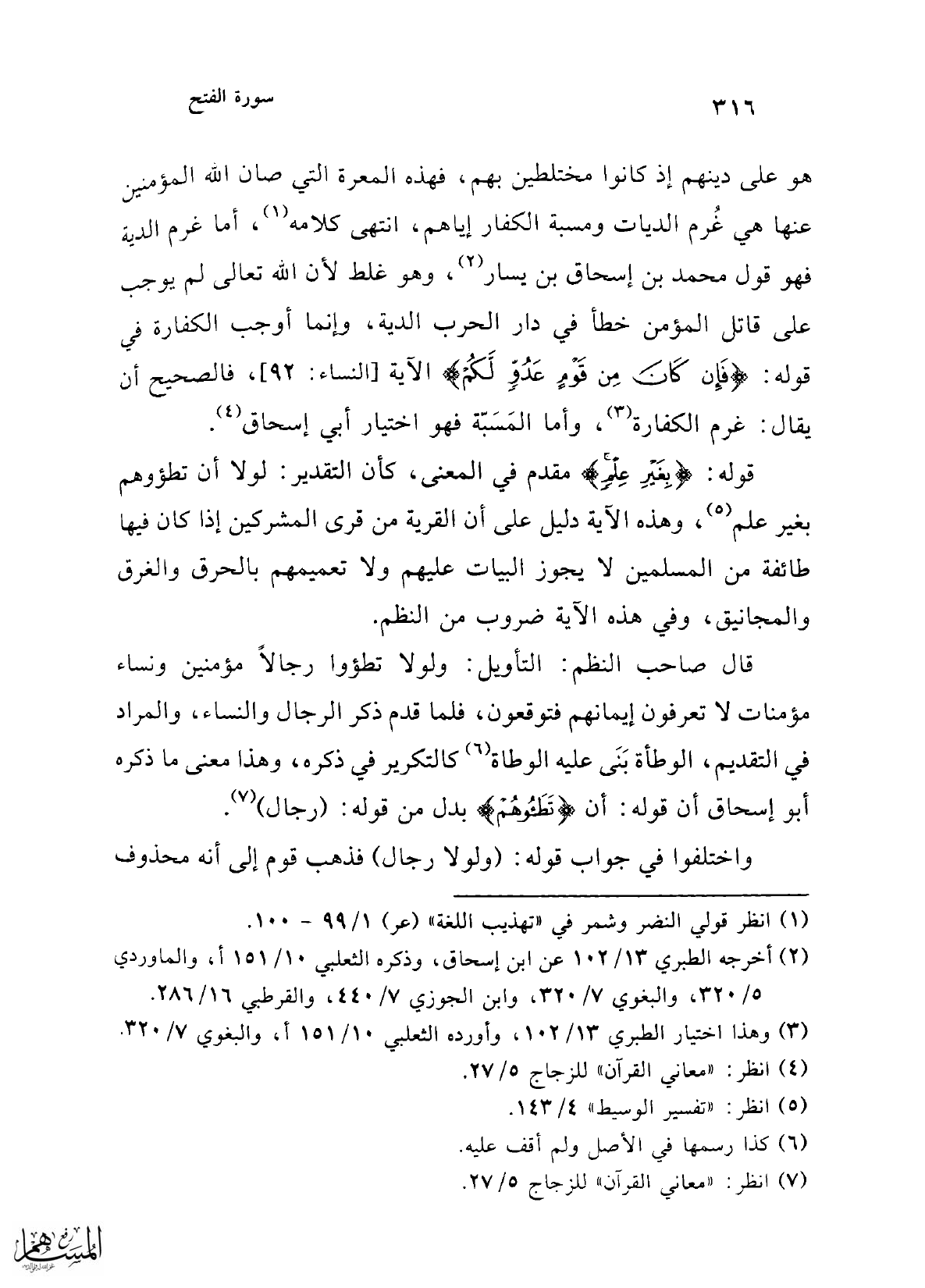 هو على دينهم إذ كانوا مختلطين بهم، فهذه المعرة التي صان الله المؤمنين عنها هي غُرم الديات ومسبة الكفار إياهم، انتهى كلامه (¬1)، أما غرم الدية فهو قول محمد بن إسحاق بن يسار (¬2)، وهو غلط لأن الله تعالى لم يوجب على قاتل المؤمن خطأ في دار الحرب الدية، وإنما أوجب الكفارة في قوله: {فَإِنْ كَانَ مِنْ قَوْمٍ عَدُوٍّ لَكُمْ} [النساء: 92]، فالصحيح أن يقال: غرم الكفارة (¬3)، وأما المَسَبّة فهو اختيار أبي إسحاق (¬4).