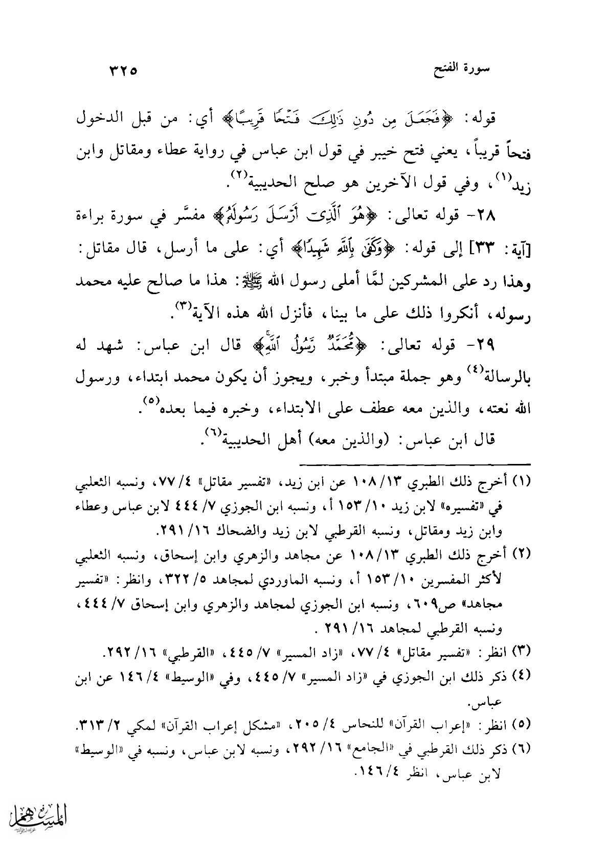 قوله: {فَجَعَلَ مِنْ دُونِ ذَلِكَ فَتْحًا قَرِيبًا} أي: من قبل الدخول فتحاً قريباً، يعني فتح خيبر في قول ابن عباس في رواية عطاء ومقاتل وابن زيد (¬1)، وفي قول الآخرين هو صلح الحديبية (¬2).