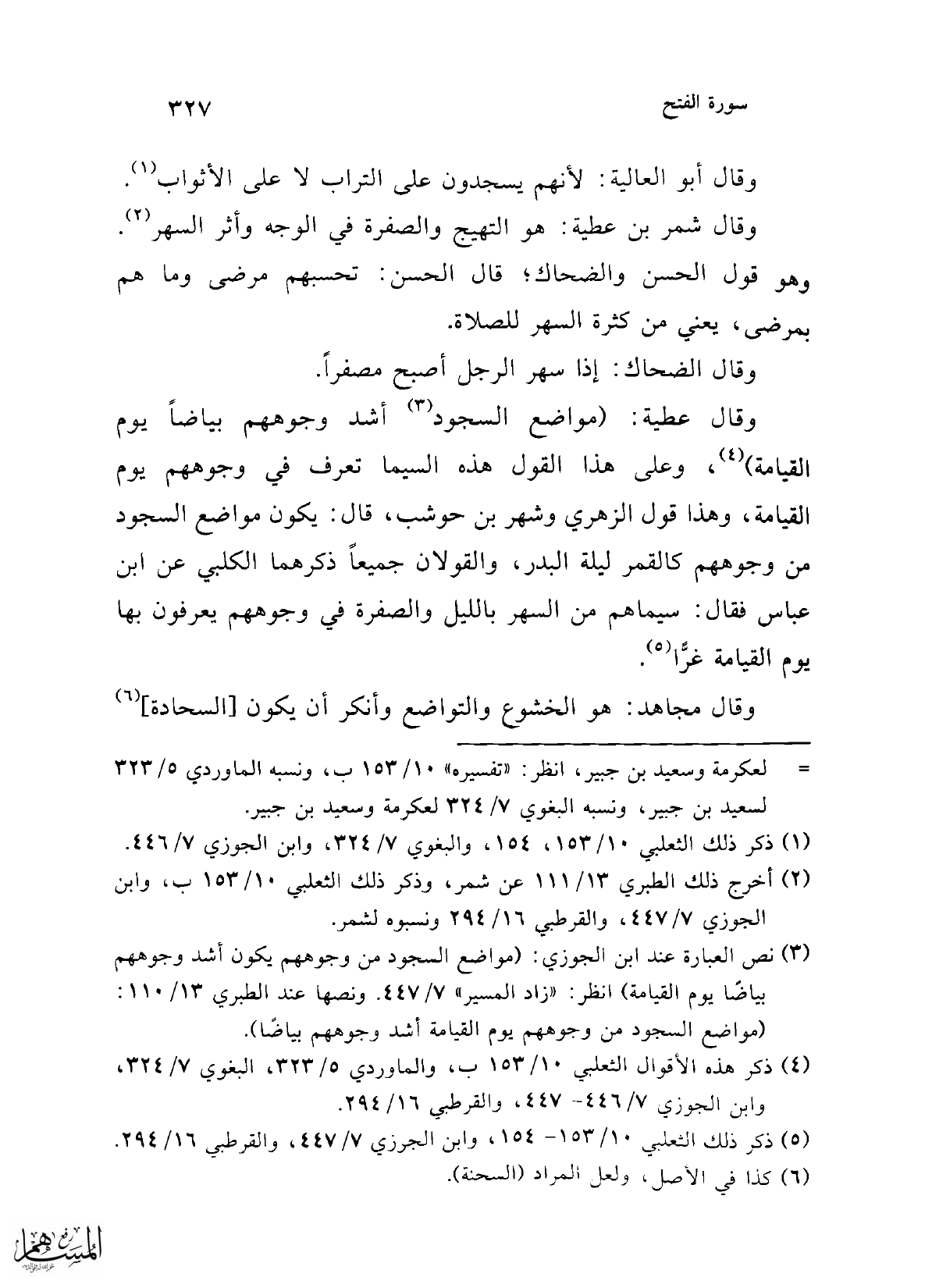 (¬3) نص العبارة عند ابن الجوزي: (مواضع السجود من وجوههم يكون أشد وجوههم بياضًا يوم القيامة) انظر: "زاد المسير" 7/ 447. ونصها عند الطبري 13/ 110: (مواضع السجود من وجوههم يوم القيامة أشد وجوههم بياضًا).