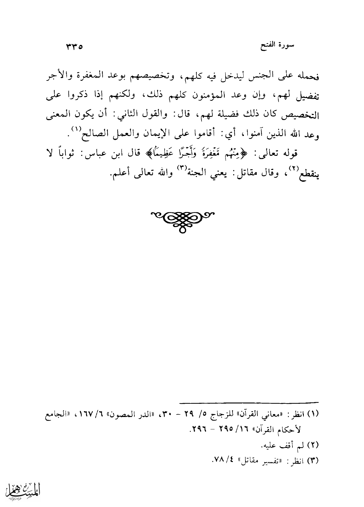 فحمله على الجنس ليدخل فيه كلهم، وتخصيصهم بوعد المغفرة والأجر تفصيل لهم، وإن وعد المؤمنون كلهم ذلك، ولكنهم إذا ذكروا على التخصيص كان ذلك فضيلة لهم، قال: والقول الثاني: أن يكون المعنى وعد الله الذين آمنوا، أي: أقاموا على الإيمان والعمل الصالح (¬1).