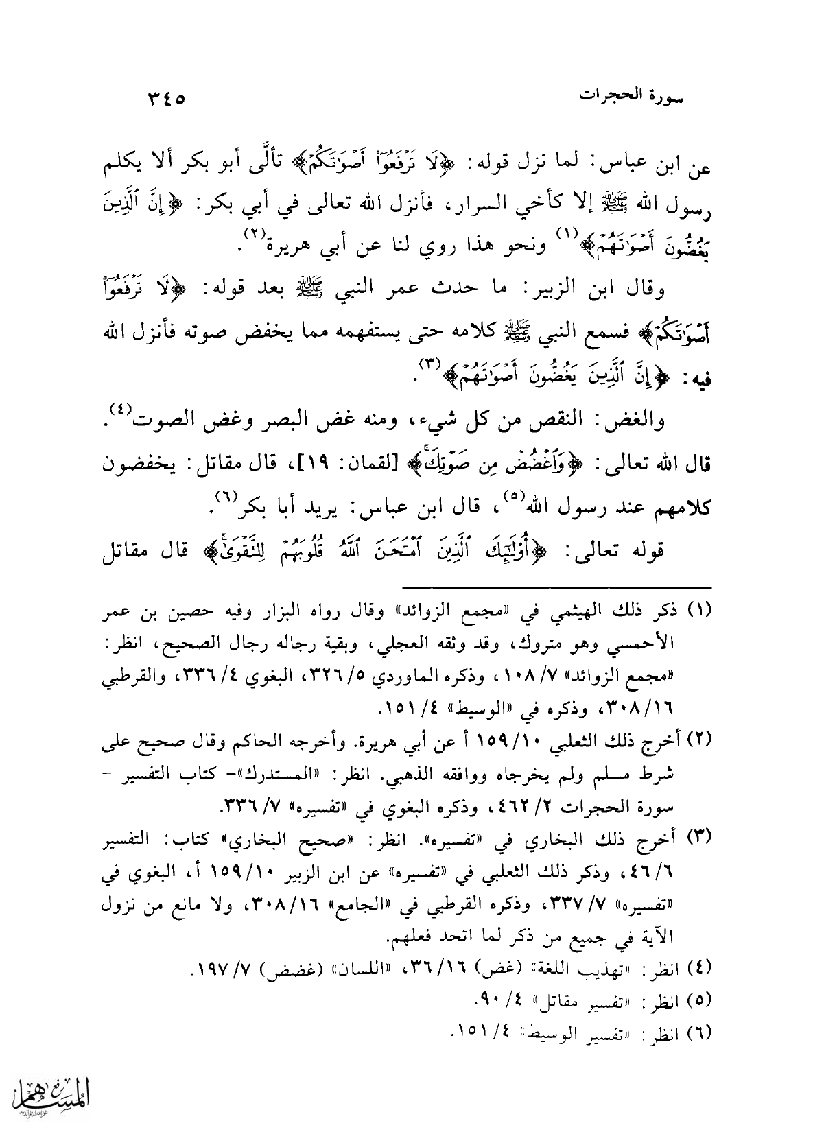 وقال ابن الزبير: ما حدث عمر النبي -صلى الله عليه وسلم- بعد قوله: {لَا تَرْفَعُوا أَصْوَاتَكُمْ} فسمع النبي -صلى الله عليه وسلم- كلامه حتى يستفهمه بما يخفض صوته فأنزل الله فيه: {إِنَّ الَّذِينَ يَغُضُّونَ أَصْوَاتَهُمْ} (¬3).