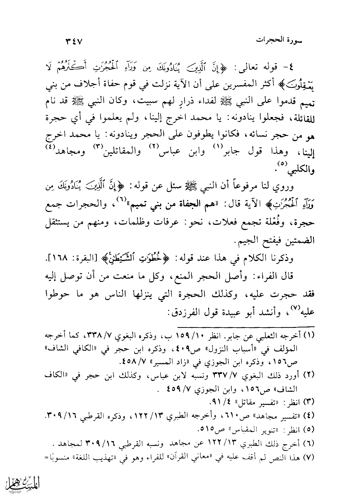 4 - قوله تعالى: {إِنَّ الَّذِينَ يُنَادُونَكَ مِنْ وَرَاءِ الْحُجُرَاتِ أَكْثَرُهُمْ لَا يَعْقِلُونَ} أكثر المفسرين على أن الآية نزلت في قوم حفاة أجلاف من بني تميم قدموا على النبي -صلى الله عليه وسلم- لفداء ذرارٍ لهم سبيت، وكان النبي -صلى الله عليه وسلم- قد نام للقائلة، فجحلوا ينادونه: يا محمد اخرج إلينا, ولم يعلموا في أي حجرة هو من حجر نسائه، فكانوا يطوفون على الحجر وينادونه: يا محمد اخرج إلينا، وهذا قول جابر (¬1) وابن عباس (¬2) والمقاتلين (¬3) ومجاهد (¬4) والكلبي (¬5).