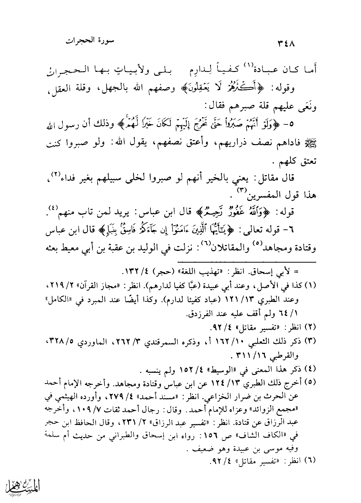5 - {وَلَوْ أَنَّهُمْ صَبَرُوا حَتَّى تَخْرُجَ إِلَيْهِمْ لَكَانَ خَيْرًا لَهُمْ} وذلك أن رسول الله -صلى الله عليه وسلم- فاداهم نصف ذراريهم، وأعتق نصفهم، يقول الله: ولو صبروا كنت تعتق كلهم.