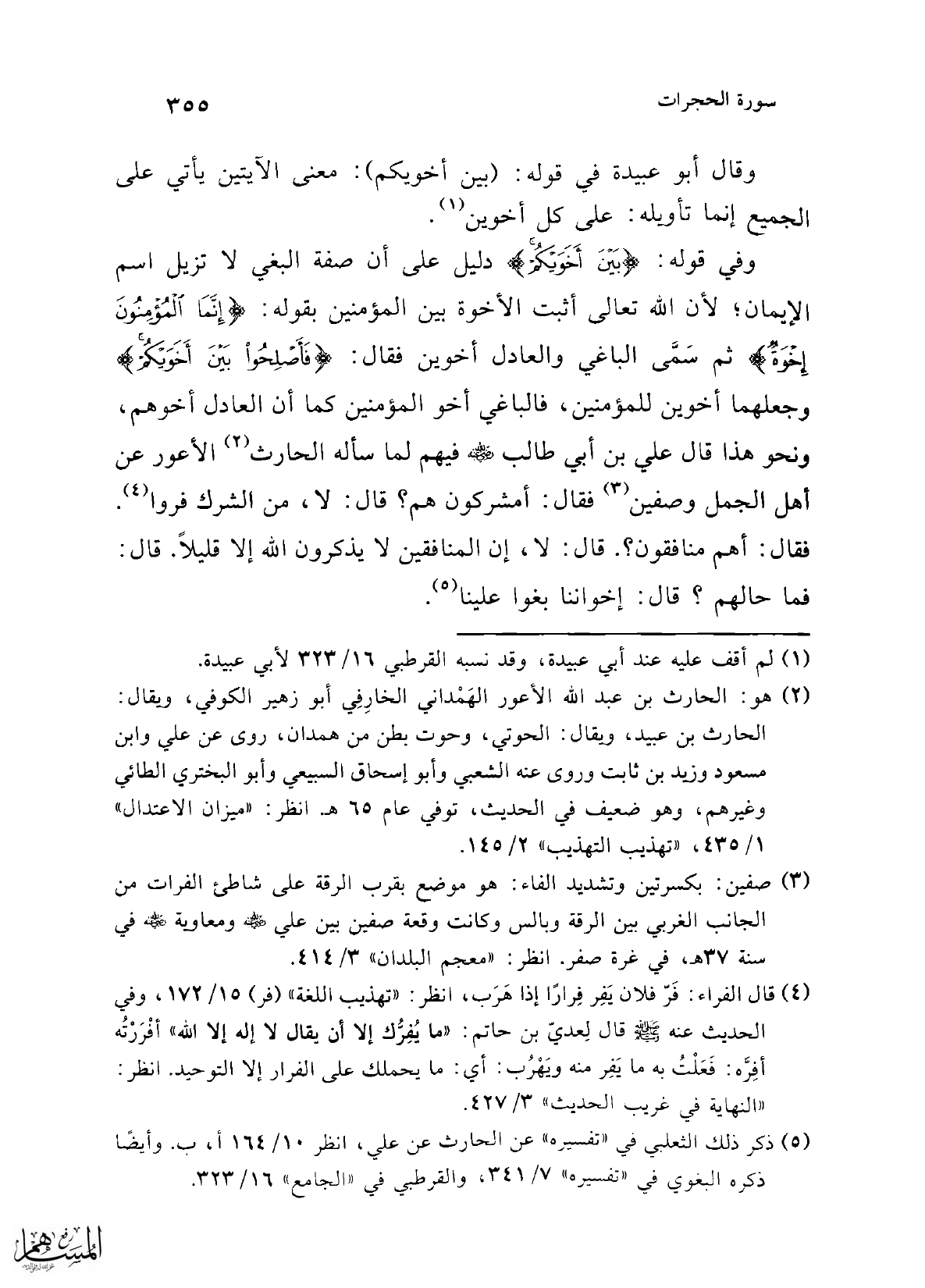 وفي قوله: {بَيْنَ أَخَوَيْكُمْ} دليل على أن صفة البغي لا تزيل اسم الإيمان؛ لأن الله تعالى أثبت الأخوة بين المؤمنين بقوله: {إِنَّمَا الْمُؤْمِنُونَ إِخْوَةٌ} ثم سَمَّى الباغي والعادل أخوين فقال: {فَأَصْلِحُوا بَيْنَ أَخَوَيْكُمْ} وجعلهما أخوين للمؤمنين، فالباغي أخو المؤمنين كما أن العادل أخوهم، ونحو هذا قال علي بن أبي طالب -رضي الله عنه- فيهم لما سأله الحارث (¬2) الأعور عن أهل الجمل وصفين (¬3) فقال: أمشركون هم؟ قال: لا، من الشرك فروا (¬4). فقال: أهم منافقون؟. قال: لا، إن المنافقين لا يذكرون الله إلا قليلاً. قال: فما حالهم؟ قال: إخواننا بغوا علينا (¬5).