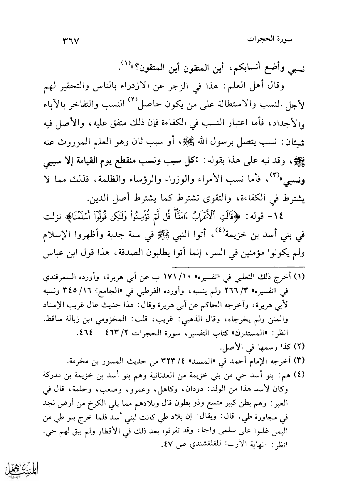 وقال أهل العلم: هذا في الزجر عن الازدراء بالناس والتحقير لهم لأجل النسب والاستطالة على من يكون حاصل (¬2) النسب والتفاخر بالآباء والأجداد، فأما اعتبار النسب في الكفاءة فإن ذلك متفق عليه، والأصل فيه شيئان: نسب يتصل برسول الله -صلى الله عليه وسلم-، أو سبب ثان وهو العلم الموروث عنه -صلى الله عليه وسلم-، وقد نبه على هذا بقوله: "كل سبب ونسب منقطع يوم القيامة إلا سببي ونسبي" (¬3)، فأما نسب الأمراء والوزراء والرؤساء والظلمة، فذلك مما لا يشترط في الكفاءة، والتقوى تشترط كما يشترط أصل الدين.