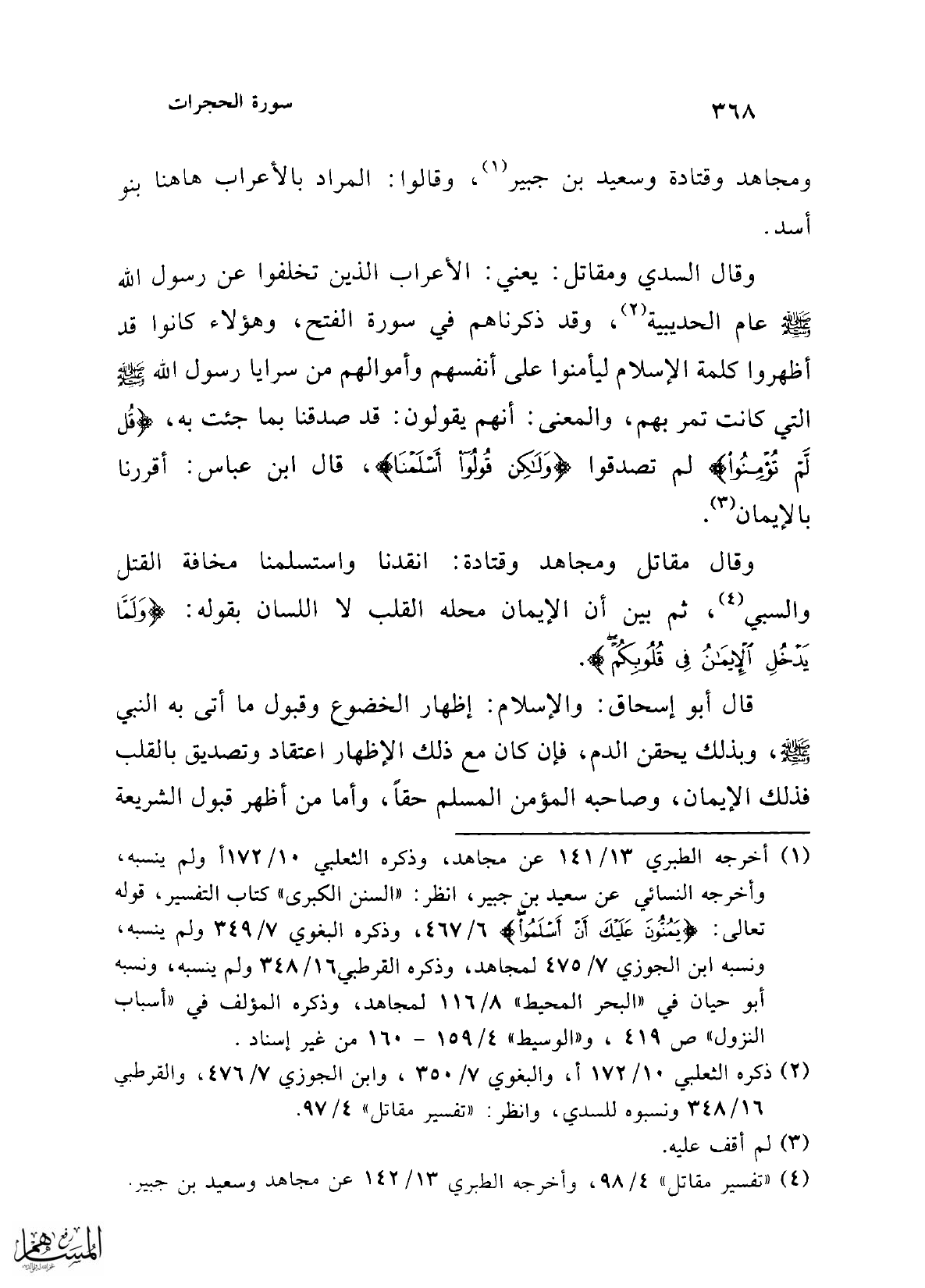 (¬1) أخرجه الطبري 13/ 141 عن مجاهد، وذكره الثعلبي 10/ 172 أولم ينسبه، وأخرجه النسائي عن سعيد بن جير، انظر: "السنن الكبرى" كتاب التفسير، قوله تعالى: {يَمُنُّونَ عَلَيْكَ أَنْ أَسْلَمُوا} 6/ 467، وذكره البغوي 7/ 349 ولم ينسبه، ونسبه ابن الجوزي 7/ 475 لمجا هد، وذكره القرطبي 16/ 348 ولم ينسبه، ونسبه أبو حيان في "البحر المحيط" 8/ 116 لمجاهد، وذكره المؤلف في "أسباب النزول" ص 419، و"الوسيط" 4/ 159 - 160 من غير إسناد.
