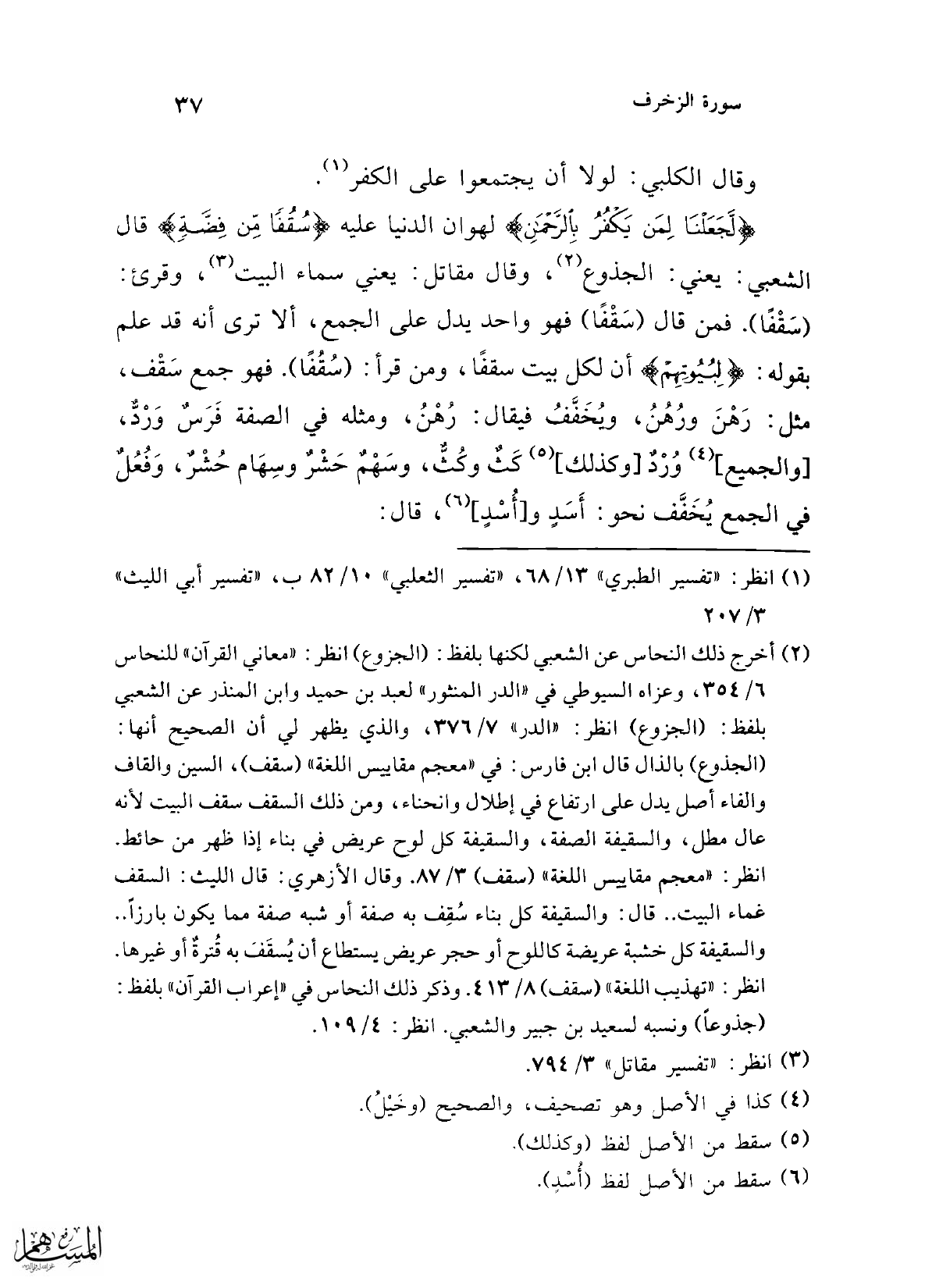 {لَجَعَلْنَا لِمَنْ يَكْفُرُ بِالرَّحْمَنِ} لهوان الدنيا عليه {سُقُفًا مِنْ فِضَّةٍ} قال الشعبي: يعني: الجذوع (¬2)، وقال مقاتل: يعني سماء البيت (¬3)، وقرئ: {سُقُفًا}. فمن قال (سَقْفًا) فهو واحد يدل على الجمع، ألا ترى أنه قد علم بقوله: {لِبُيُوتِهِمْ} أن لكل بيت سقفًا، ومن قرأ: (سُقُفًا). فهو جمع سَقْف، مثل: رَهْنَ ورُهُنُ، ويُخَفَّفُ فيقال: رُهْنُ، ومثله في الصفة فَرَسٌ وَرْدٌّ، [والجميع] (¬4) وُرْدٌ [وكذلك] (¬5) كَثٌ وكُثٌّ، وسَهْمٌ حَشْرٌ وسِهَام حُشْرٌ، وَفُعُلٌ في الجمع يُخَفَّف نحو: أَسَدٍ و [أُسْدٍ] (¬6)، قال: