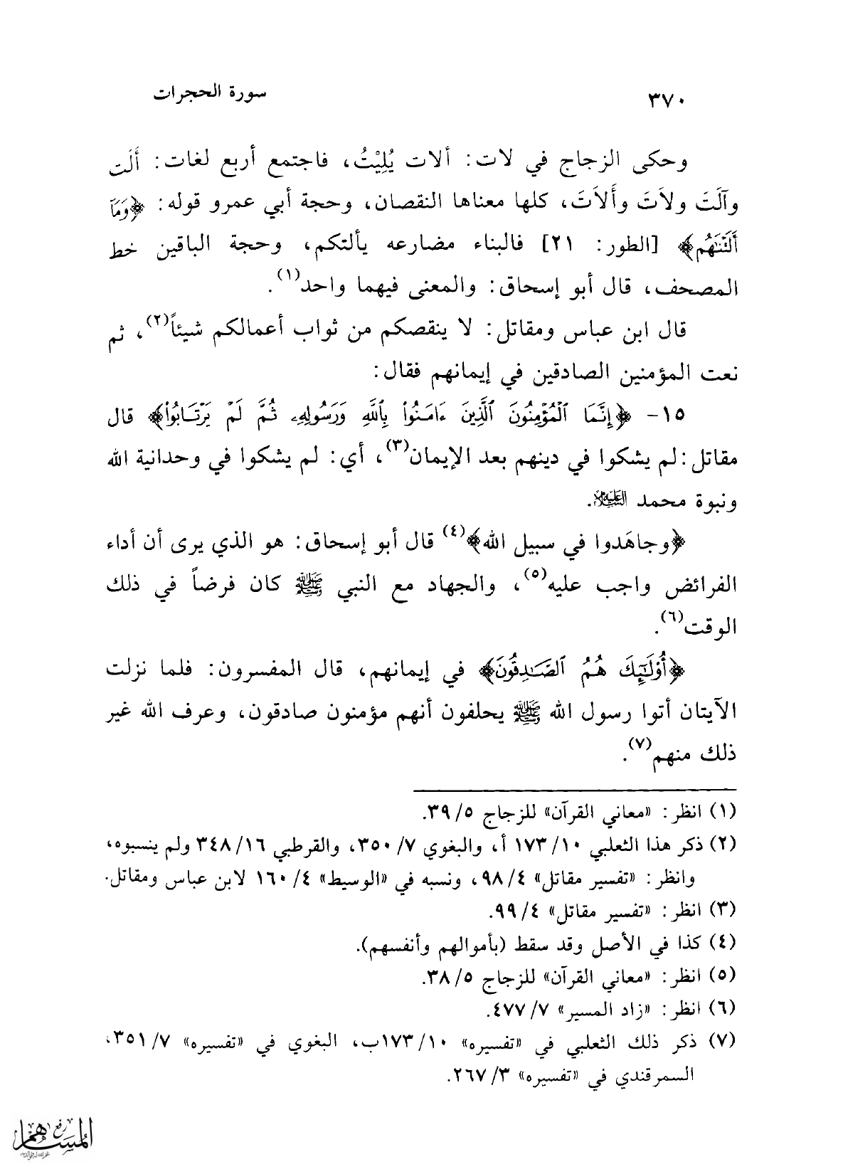 15 - {إِنَّمَا الْمُؤْمِنُونَ الَّذِينَ آمَنُوا بِاللَّهِ وَرَسُولِهِ ثُمَّ لَمْ يَرْتَابُوا} قال مقاتل: لم يشكوا في دينهم بعد الإيمان (¬3)، أي: لم يشكوا في وحدانية الله ونبوة محمد -عليه السلام-.