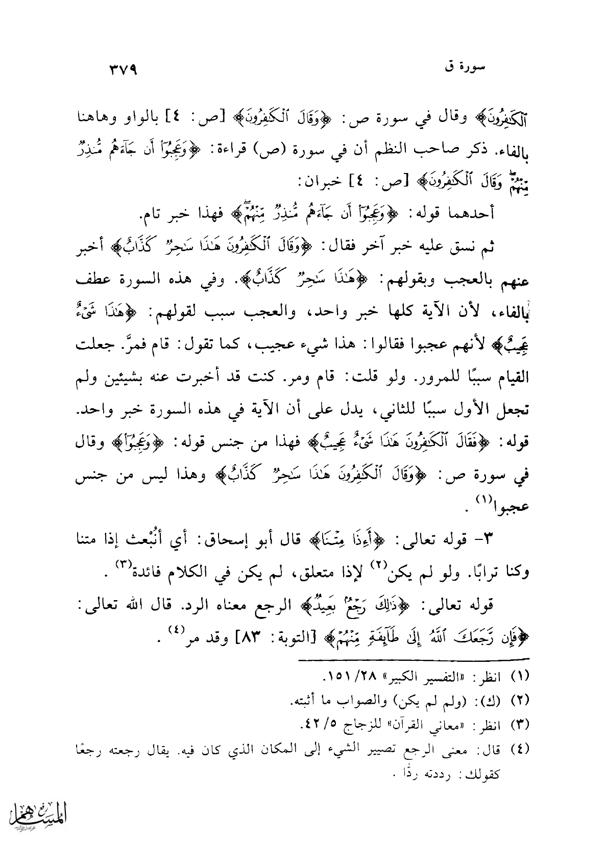 الْكَافِرُونَ} وقال في سورة ص: {وَقَالَ الْكَافِرُونَ} [ص: 4] بالواو وهاهنا بالفاء. ذكر صاحب النظم أن في سورة (ص) قراءة: {وَعَجِبُوا أَنْ جَاءَهُمْ مُنْذِرٌ مِنْهُمْ وَقَالَ الْكَافِرُونَ} [ص: 4] خبران: