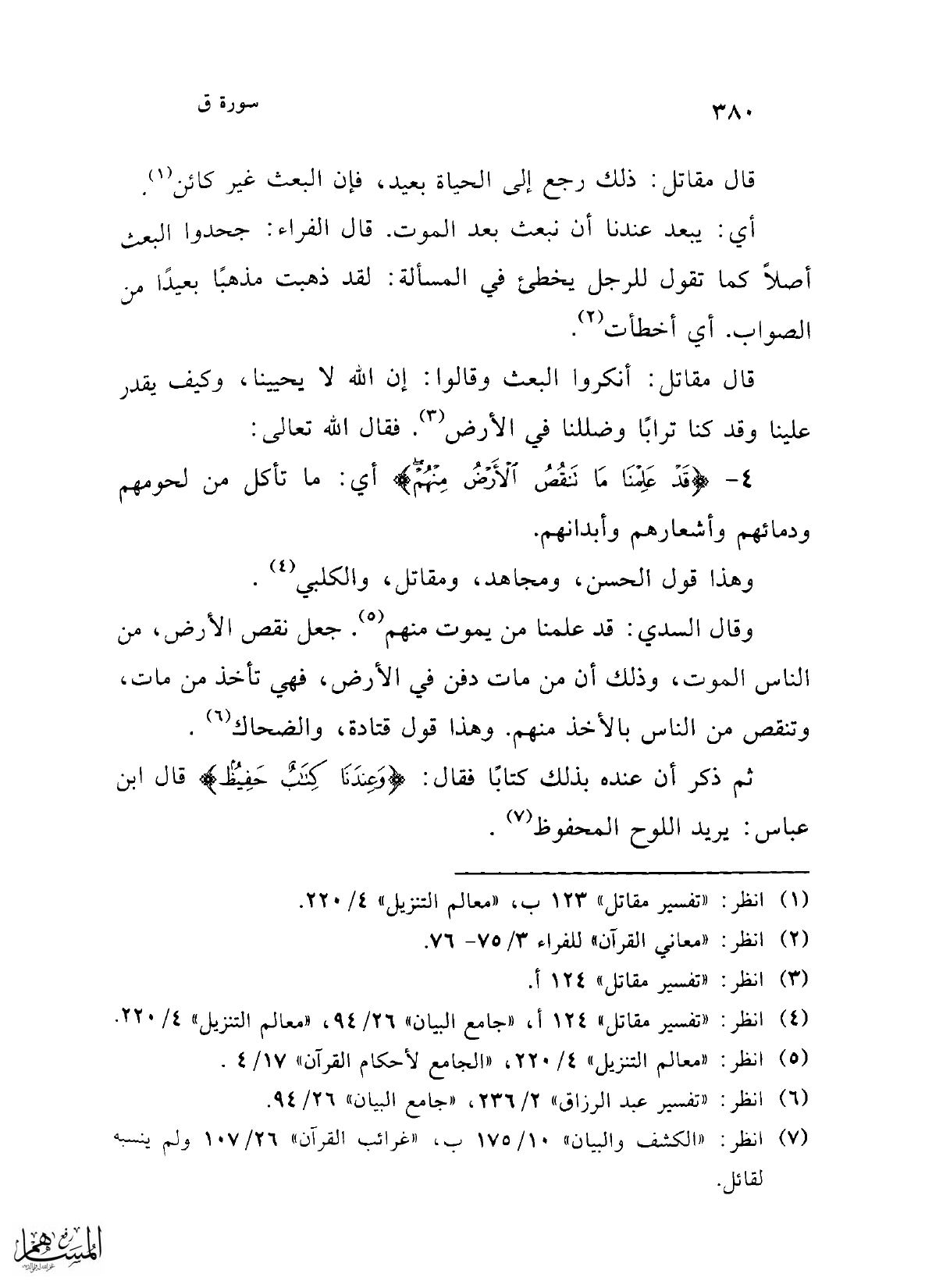 (¬4) انظر: "تفسير مقاتل" 124 أ، "جامع البيان" 26/ 94، "معالم التنزيل" 4/ 220.