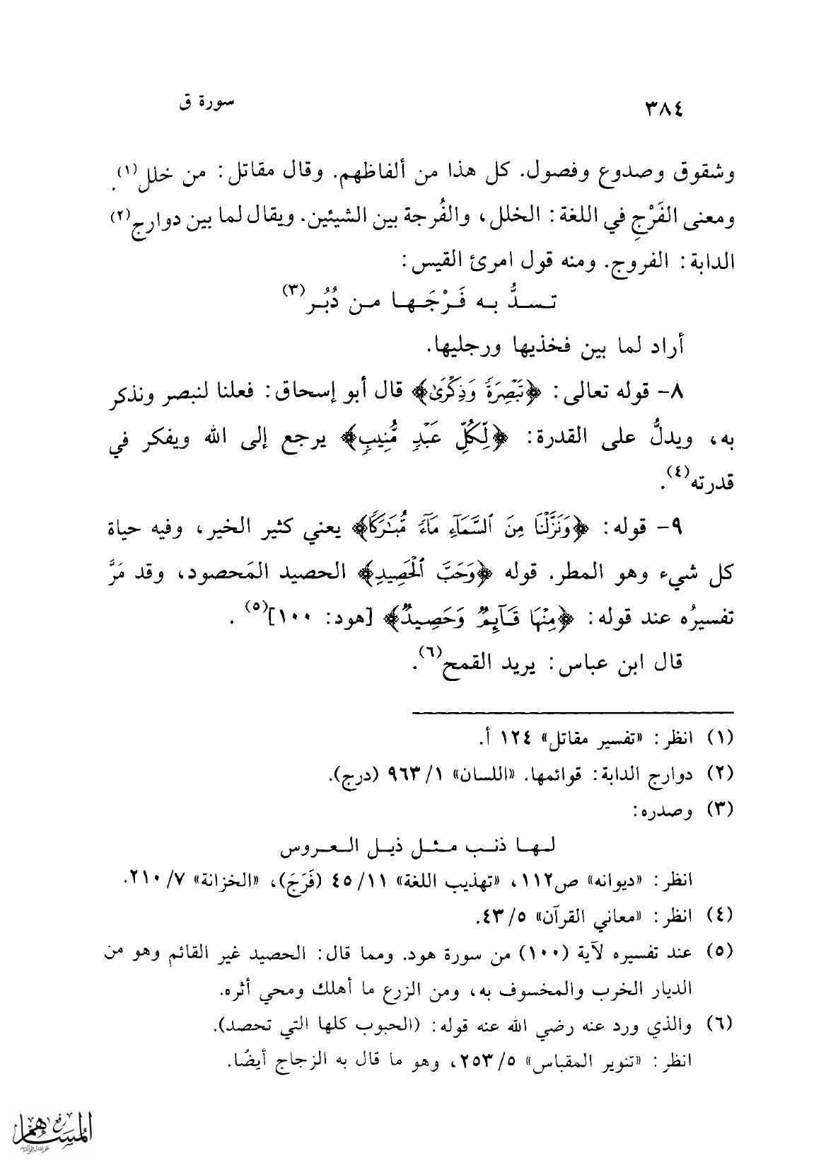 (¬5) عند تفسيره لآية (100) من سورة هود. ومما قال: الحصيد غير القائم وهو من الديار الخرب والمخسوف به، ومن الزرع ما أهلك ومحي أثره.