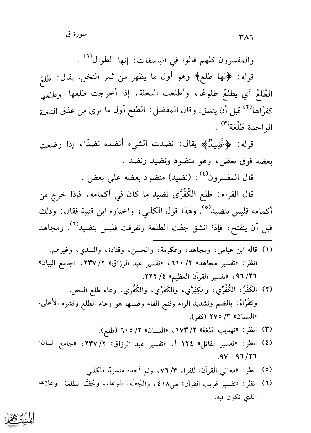 قال الفراء: طلع الكُفُرَّى نضيد ما كان في أكمامه، فإذا خرج من أكمامه فليس بنضيد (¬5). وهذا قول الكلبي، واختاره ابن قتيبة فقال: وذلك قبل أن ينفتح، فإذا انشق جفت الطلعة وتفرقت فليس بنضيد (¬6). ومجاهد