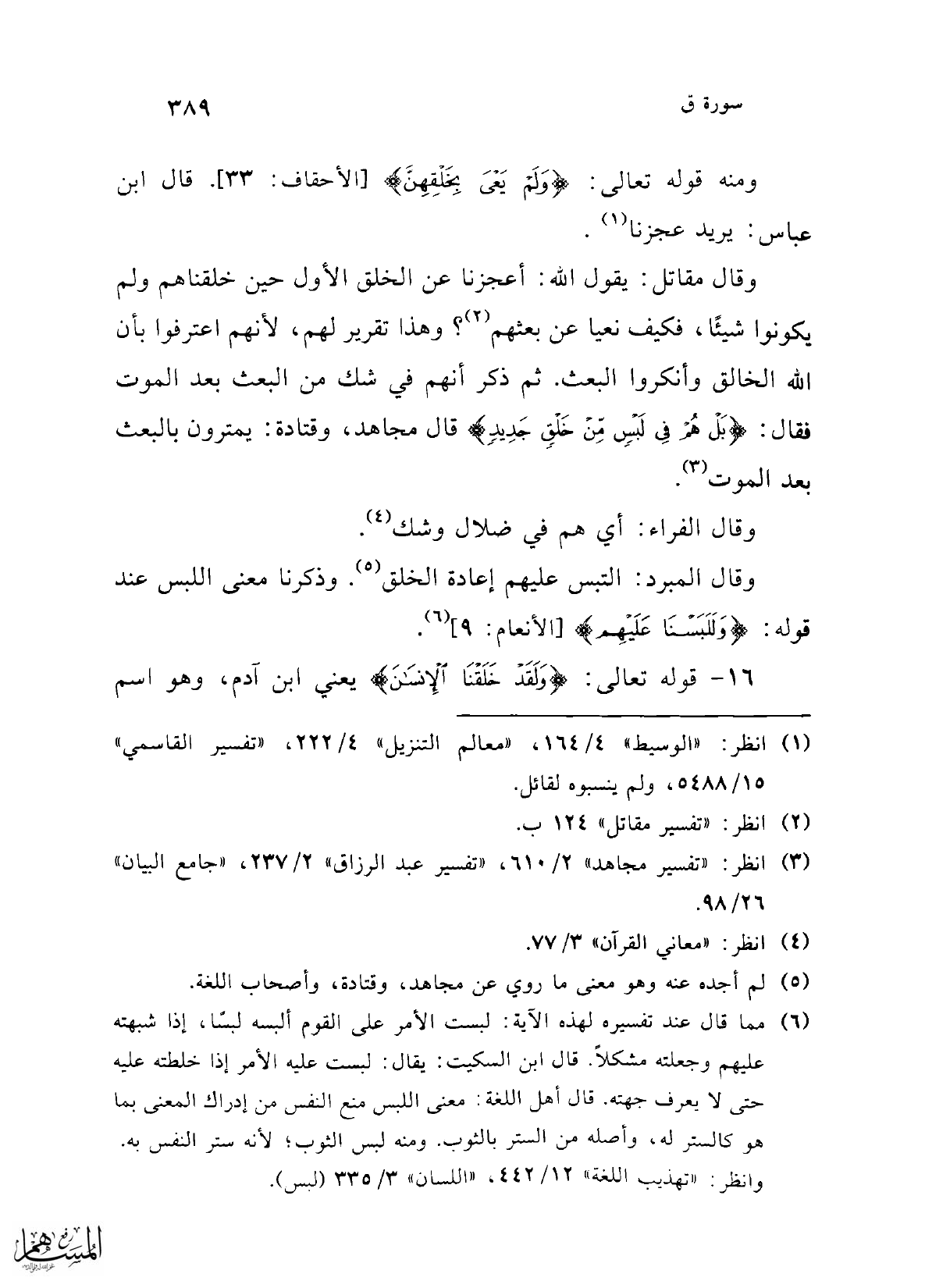(¬6) مما قال عند تفسيره لهذه الآية: لبست الأمر على القوم ألبسه لبسًا، إذا شبهته عليهم وجعلته مشكلاً. قال ابن السكب: يقال: لبست عليه الأمر إذا خلطته عليه حتى لا يعرف جهته. قال أهل اللغة: معنى اللبس منع النفس من إدراك المعنى بما هو كالستر له، وأصله من الستر بالثوب. ومنه لبس الثوب؛ لأنه ستر النفس به.