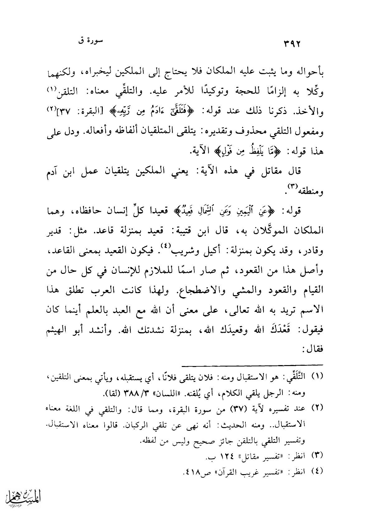 (¬2) عند تفسيره لآية (37) من سورة البقرة، ومما قال: والتلقي في اللغة معناه الاستقبال .. ومنه الحديث: أنه نهى عن تلقي الركبان. قالوا معناه الاستقبال. وتفسير التلقي بالتلقن جائز صحيح وليس من لفظه.
