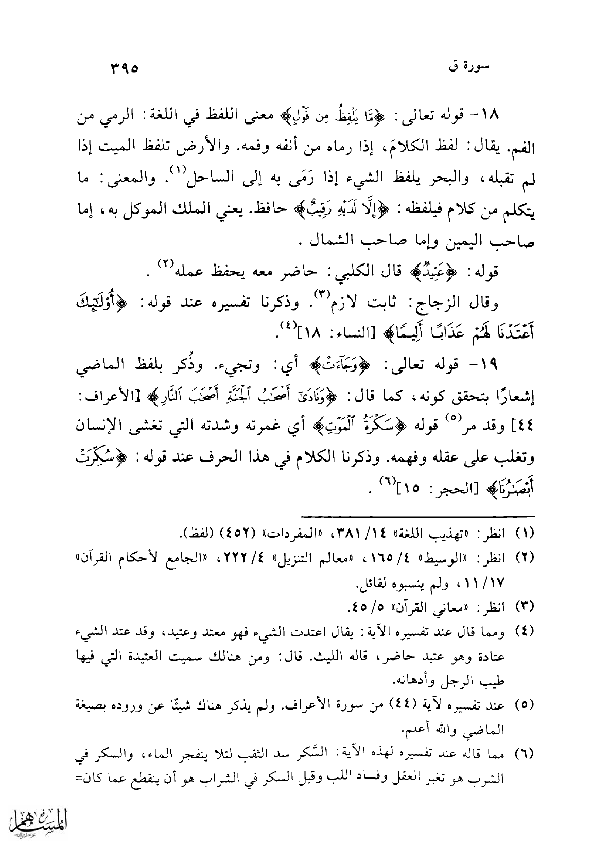 (¬4) ومما قال عند تفسيره الآية: يقال اعتدت الشيء فهو معتد وعتيد، وقد عند الشيء عتادة وهو عتيد حاضر، قاله الليث. قال: ومن هنالك سميت العتيدة التي فيها طيب الرجل وأدهانه.