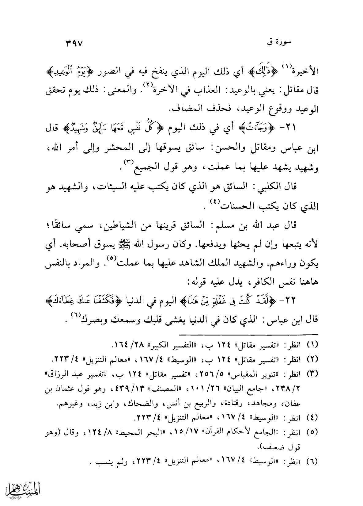 قال الكلبي: السائق هو الذي كان يكتب عليه السيئات، والشهيد هو الذي كان يكتب الحسنات (¬4).