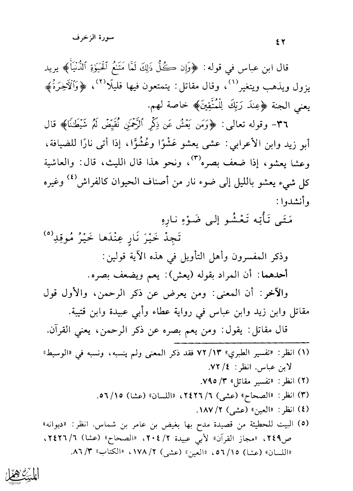 36 - وقوله تعالى: {وَمَنْ يَعْشُ عَنْ ذِكْرِ الرَّحْمَنِ نُقَيِّضْ لَهُ شَيْطَانًا} قال أبو زيد وابن الأعرابي: عشى يعشو عَشْوًا وعُشُوًّا، إذا أتى نارًا للضيافة، وعشا يعشو، إذا ضعف بصره (¬3)، ونحو هذا قال الليث، قال: والعاشية كل شيء يعشو بالليل إلى ضوء نار من أصناف الحيوان كالفراش (¬4) وغيره وأنشدوا: