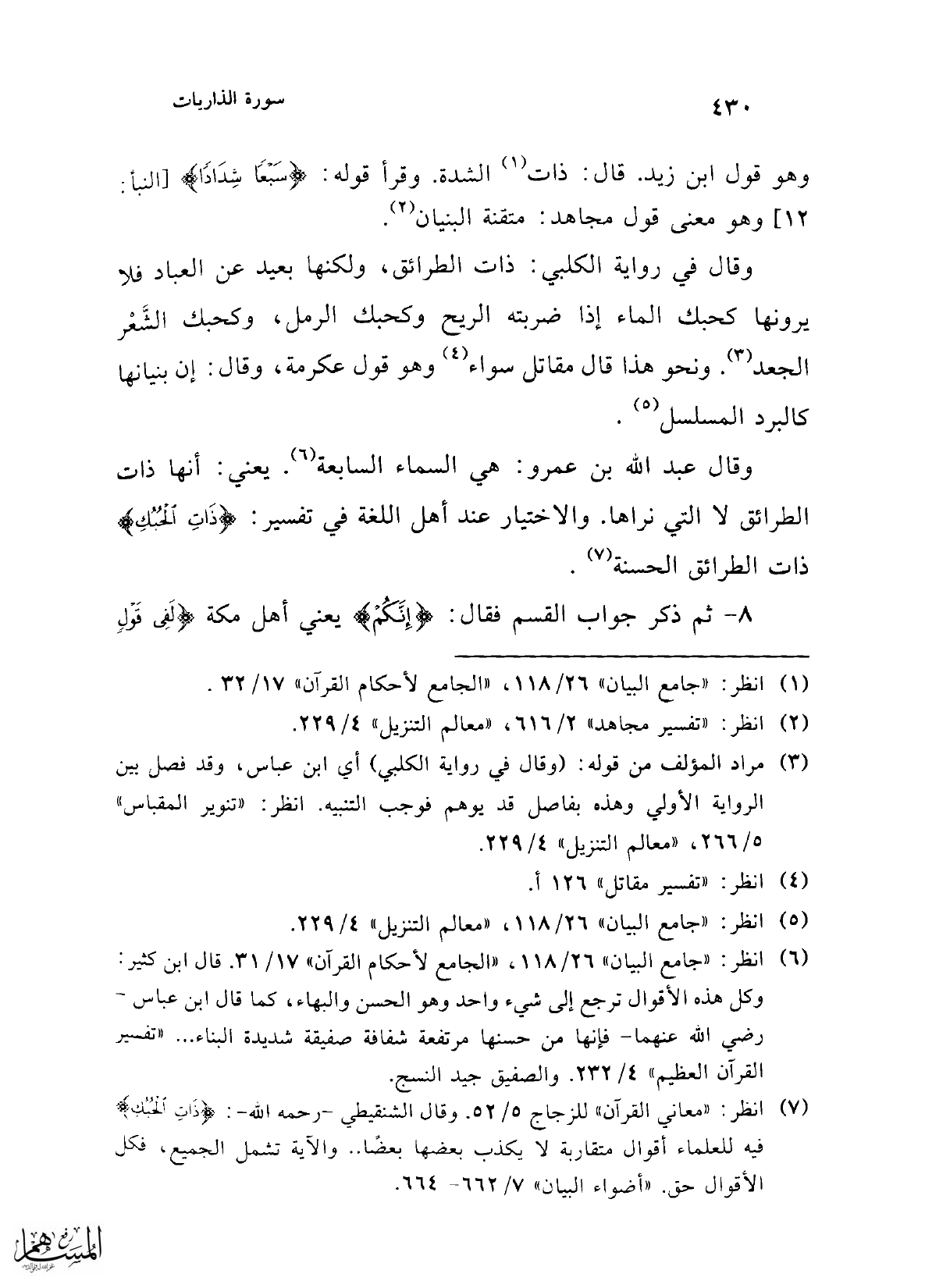 (¬7) انظر: "معاني القرآن" للزجاج 5/ 52. وقال الشنقيطي -رحمه الله-: {ذَاتِ الْحُبُكِ} فيه العلماء أقوال متقاربة لا يكذب بعضها بعضًا .. والآية تشمل الجميع، فكل الأقوال حق. "أضواء البيان" 7/ 662 - 664.